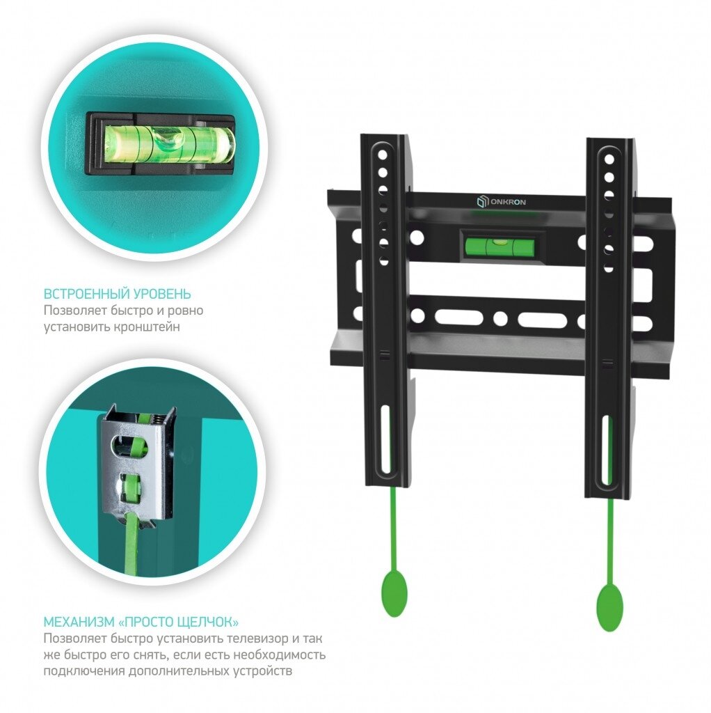 | Особенности | Встроенный уровень. Простая система фиксации Вашего телевизора. Тонкий профиль. |