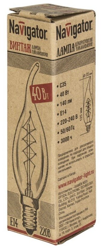 Модель: Лампа накаливания Navigator свеча на ветру прозрачная 1хЕ14х40 Вт