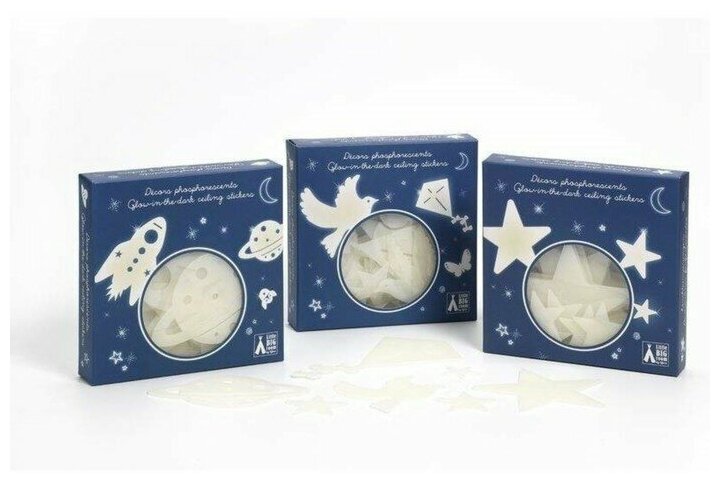 Набор Космос от знаменитого производителя Djeco это необычное украшение детской комнаты, которое светится в темноте! Всего в наборе 62 пластиковые фосфорисцирующие наклейки в форме звезд, планет, космических кораблей, ракет и летающих тарелок, которые будут светится в темноте мягким светом. Для достижения наибольшего эффекта свечения изображения должны в течении дня быть на хорошо освещенном месте. С одной стороны на фигурках нанесен клеевой слой, с помощью которого их можно прикрепить к стене над кроватью или даже на потолок. Максимальный размер наклеек (ракета) - 6,5 х 11,5 см. Набор продается в подарочной коробочке.