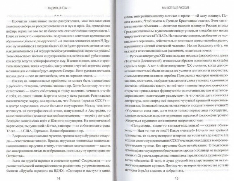 Моё мнение таково - книга Лидии Андреевны Сычёвой не просто интересна и актуальна, она отражает активную, честную и открытую гражданскую позицию автора, а также думающей части россиян, кому не безучастна судьба страны, кто радеет и за настоящее, и за будущее, прекрасно осознавая сложности и преграды на пути построения светлого будущего, нарисованного кремлёвскими долгожителями и фантазёрами.