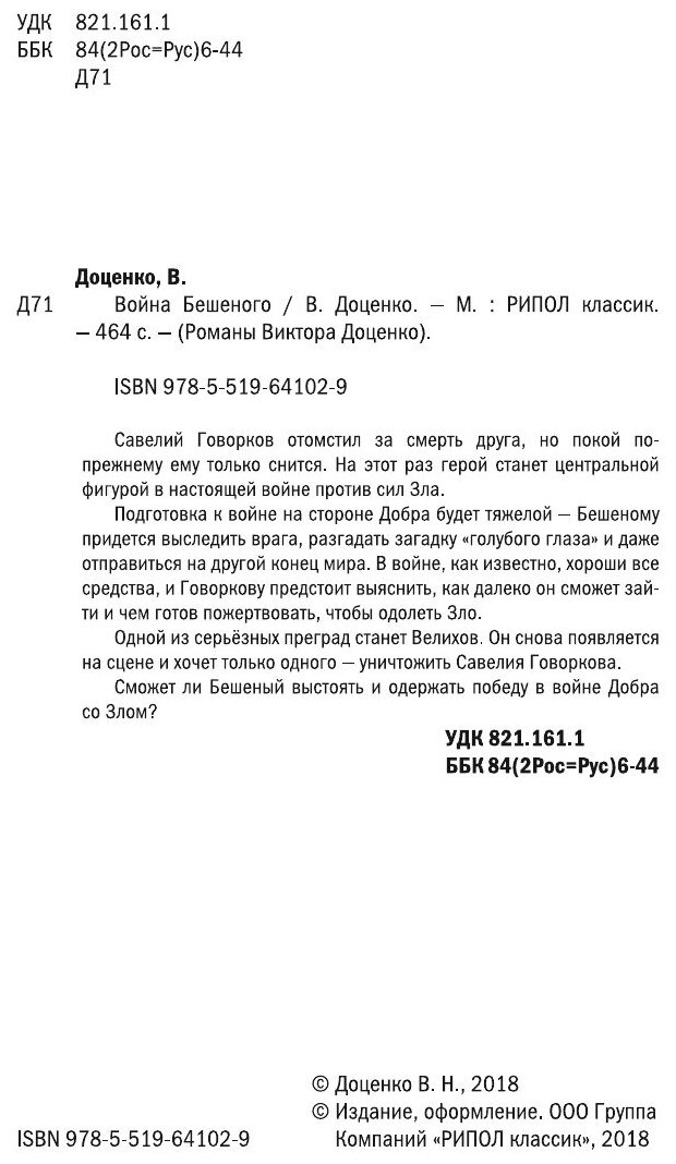 Книга: Война Бешеного (Доценко Виктор Николаевич); Рипол-Классик, 2018