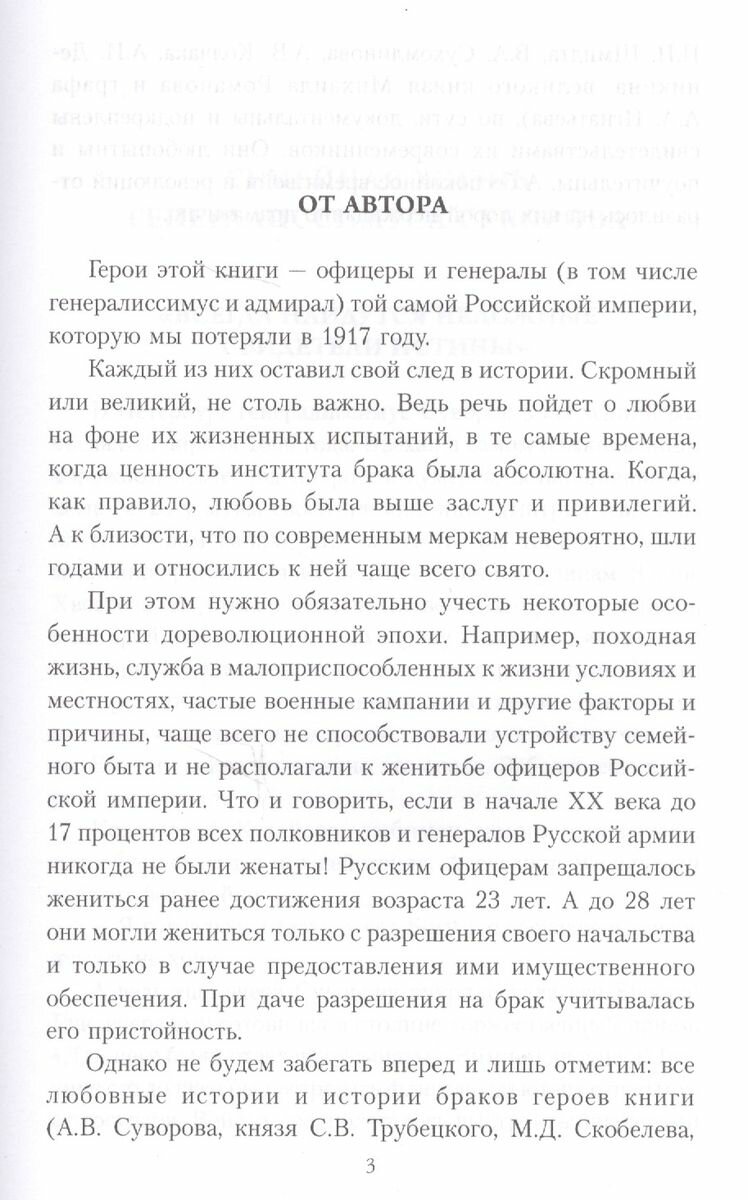 Герои этой книги - офицеры и генералы Российской империи. Каждый из них оставил свой след в истории. Скромный или великий, не столь важно. Ведь речь пойдёт о любви на фоне их жизненных испытаний, в те самые времена, когда ценность института брака была абсолютна. Когда, как правило, любовь была выше заслуг и привилегий. А к близости, что по современным меркам невероятно дико, шли годами и относились к ней чаще всего свято. Что и говорить, если в начале ХХ века до 17 % всех полковников и генералов Русской армии никогда не были женаты! Русским офицерам запрещалось жениться ранее достижения возраста 23 лет. Все любовные истории и истории браков героев книги по сути документальны и подкреплены свидетельствами их современников. Они любопытны и поучительны. А беспокойное время войн и революций отразилось на них порой неожиданно драматично.