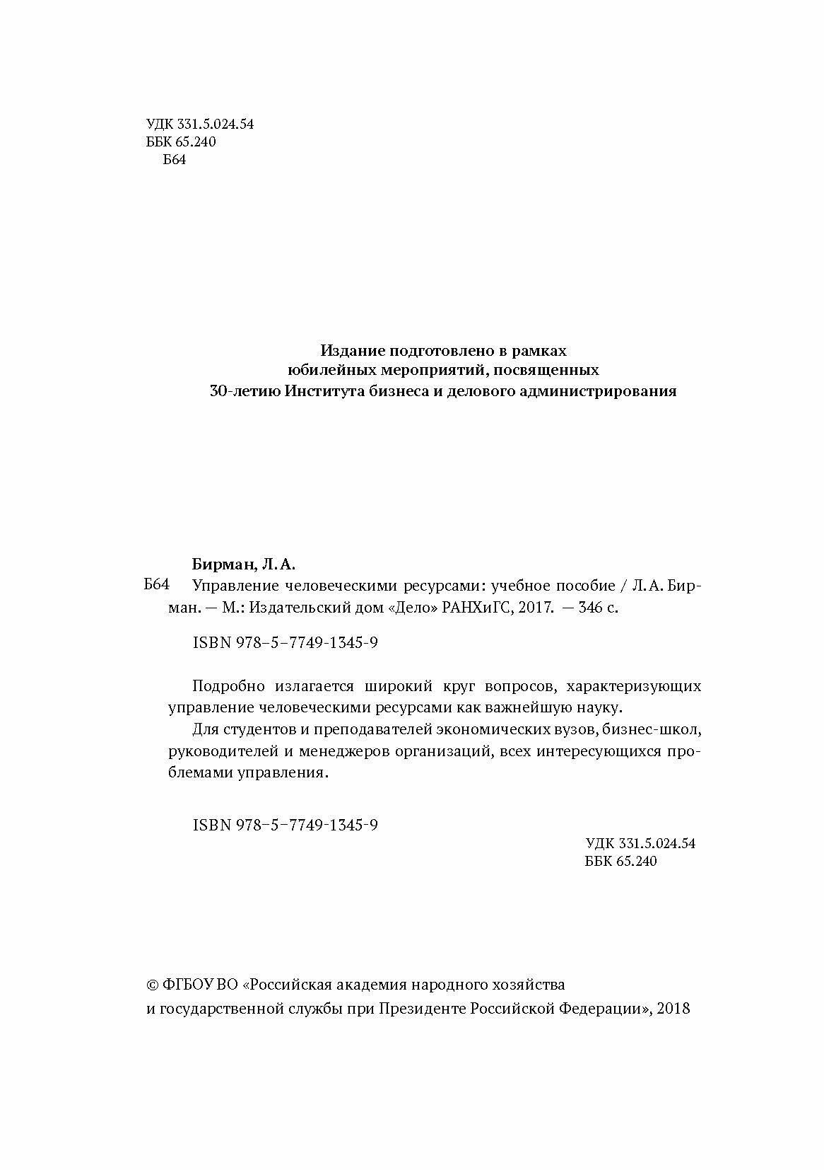 Управление человеческими ресурсами. Учебное пособие (Лариса Александровна Бирман); РАНХиГС, 2018