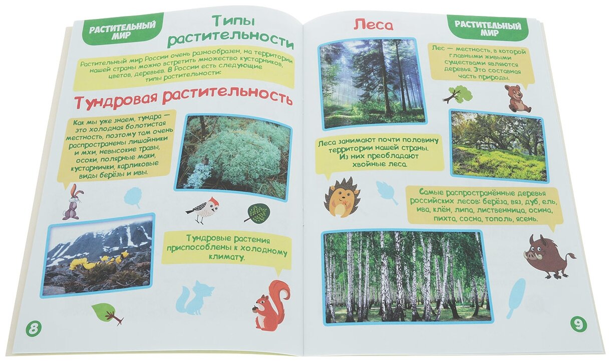 Энциклопедия для самых маленьких про природу России мне понравилась многообразием животного мира, изображённого в книге. Рассказывается не только о диких животных но и о лесных животных. Описывается разнообразие климатических зон, гор. Все страницы проиллюстрированы яркими картинками, ребёнок может наглядно убедиться в многообразии природы России и расширить свой кругозор.
