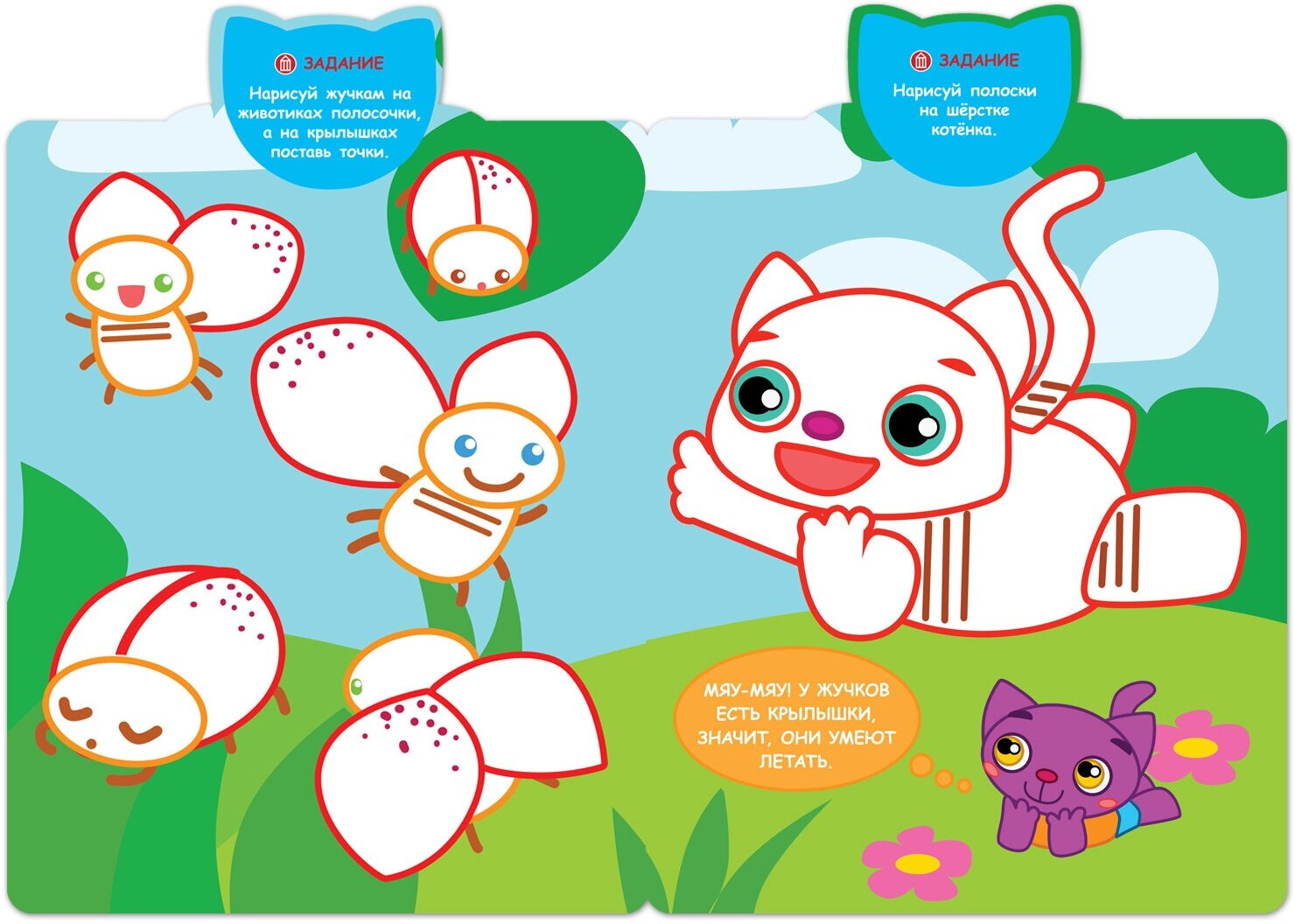 Следуя за очаровательным фиолетовым котенком, ребенок рисовать пятнышки, точки и черточки. Ему предстоит, используя подсказки, дорисовать забавные картинки. Это несложно и очень весело!