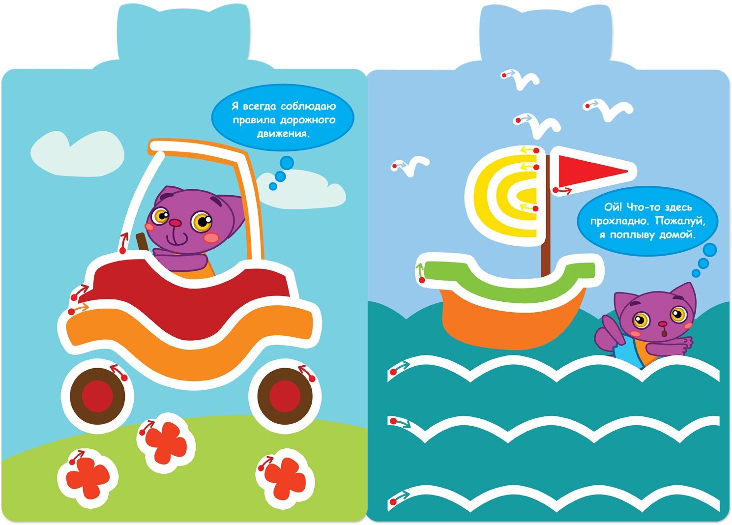 Следуя за очаровательным фиолетовым котенком, ребенок научится рисовать прямые и волнистые линии, спирали и зигзаги. Ему предстоит, используя подсказки, дорисовать забавные картинки. Это несложно и очень весело!