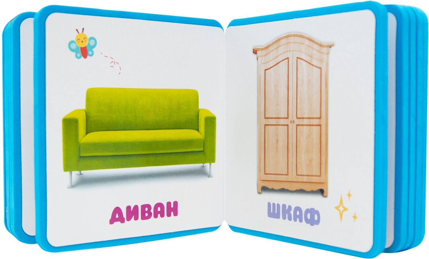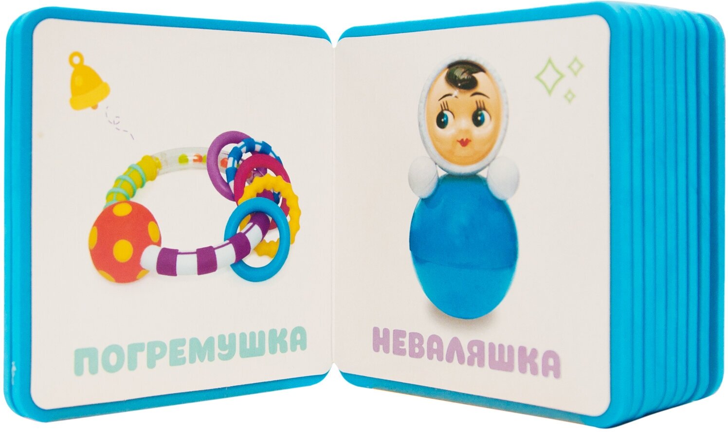 Внутри малыш найдет 20 красочных фотографий фруктов, игрушек, животных, транспорта и т. д. Рассматривая их, ребенок расширит представления об окружающем мире и пополнит свой словарный запас.
