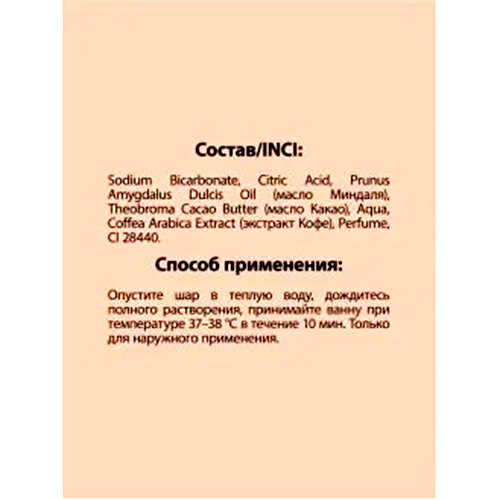 | Химический состав | Sodium bicarbonate, Citric Acid, Prunus amygdalus oil (масло Миндаля), Theobroma Cacao butter (масло Какао), Aqua, Coffea extract (экстракт Кофеина), Perfume, CI 28440 |