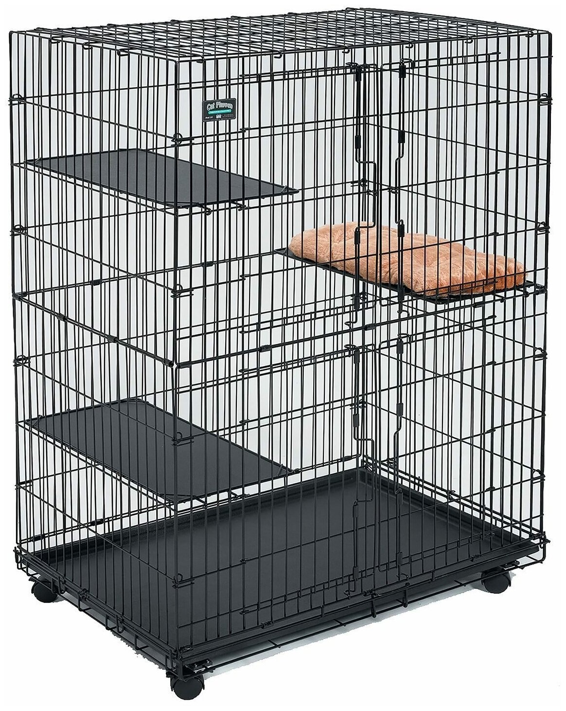 Midwest клетка для кошек Cat Playpens 89,5х59х120,6h см Двухэтажная клетка Cat Playpens для кошек прекрасно подойдет для вашего питомца! Оснащенная 2 фронтальными дверьми, 3 удобными полками, 1 лежанкой, выдвигающимся поддоном и колесами - она обеспечит комфорт вашего питомца и облегчит транспортировку!Размер клетки - 89.5 х 59 х 120.6 см.Размер ячейки 2.5х14.3 см. Толщина проволоки: 3/ 5/ 9/ 12 мм.Вес клетки 17кг (19 кг с упаковкой).