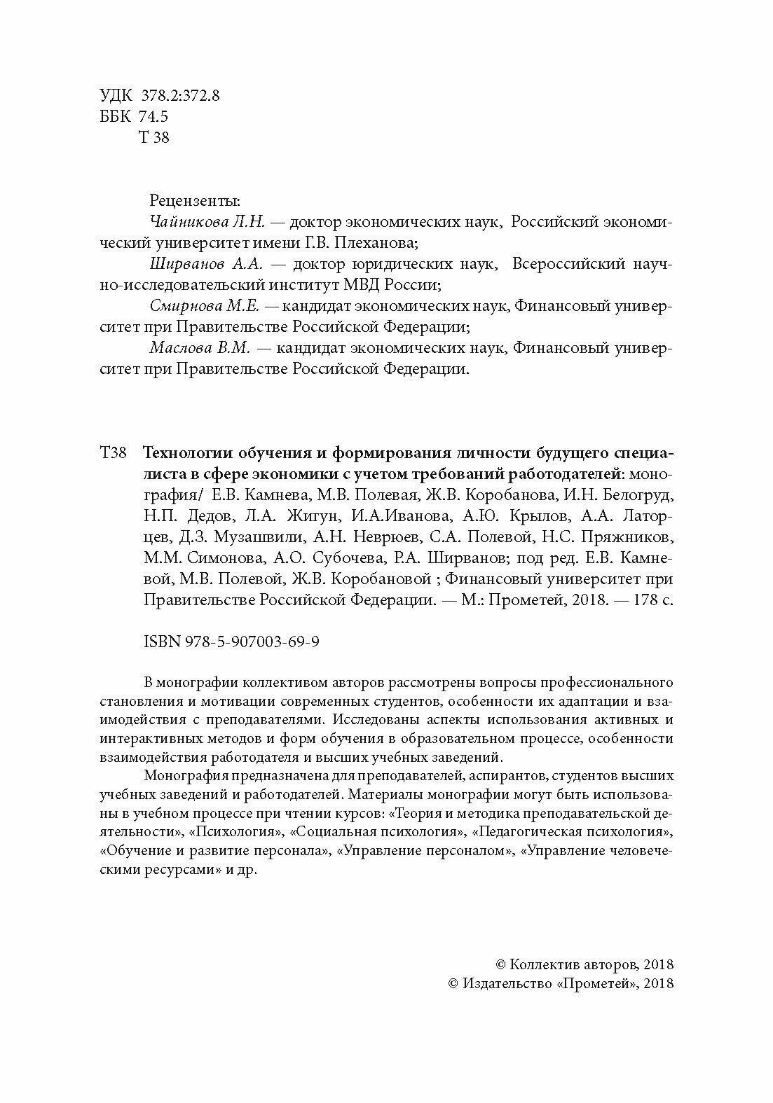 Технологии обучения и формирования личности будущего специалиста в сфере экономики. Монография (Полевая М. В., Неврюев Андрей Николаевич, Камнева Елена Владимировна, Коробанова Жанна Владимировна); Прометей, 2018
