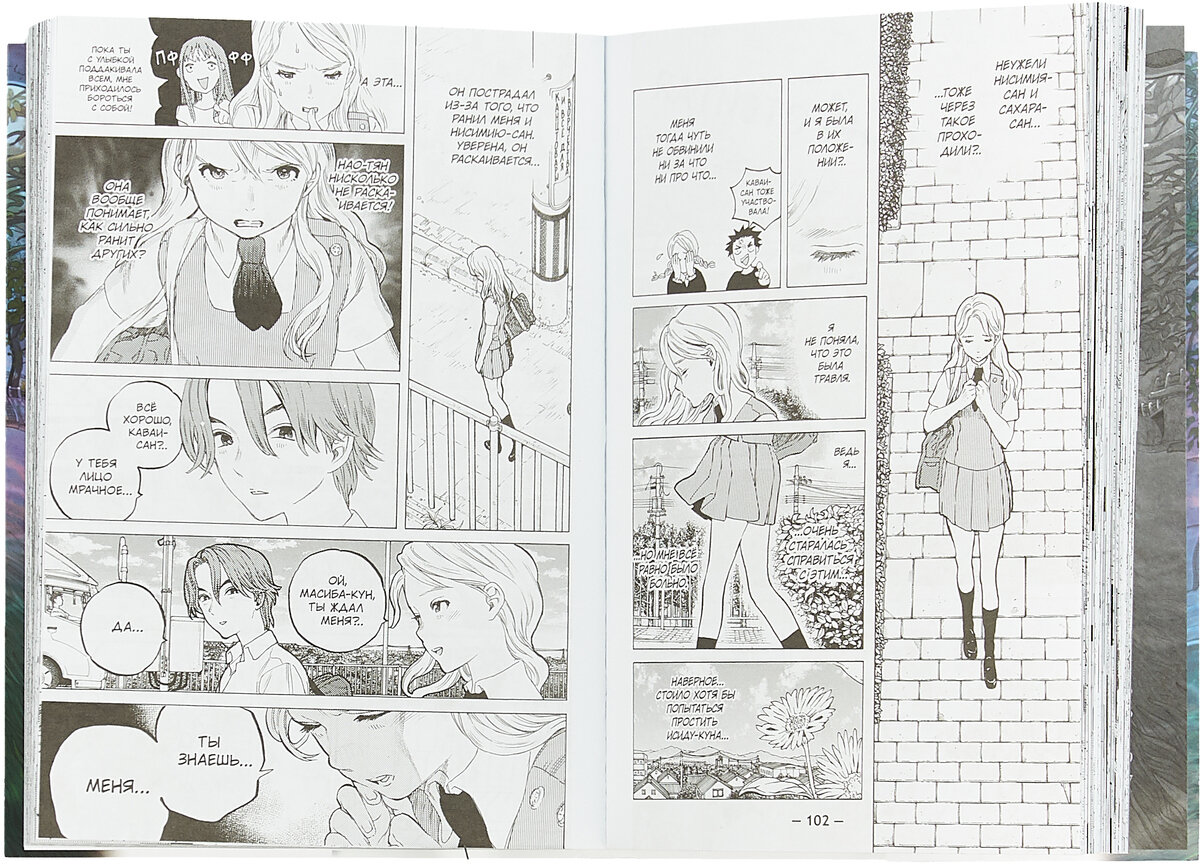 В предыдущем томе Сёя спас Сёко и попал в больницу. Нисимия чувствует себя очень виноватой, поэтому старается исправить всё в своей манере. Несмотря на то, что я смотрела аниме, я подумала, что в манге будет более выразительно развитие Сёко. На мой взгляд ей стоит стать более решительной и научиться отстаивать свои границы. Но не всё сразу.