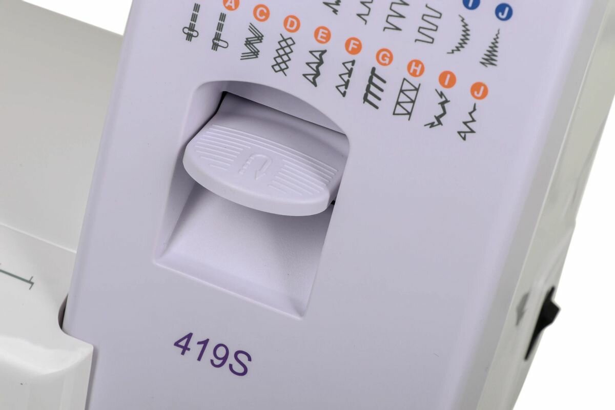 Электромеханическая швейная машина Janome 419S с вертикальным челноком, обладает набором из 19 швейных операций, среди которых рабочие, оверлочные, трикотажные и декоративные строчки, а также автоматическая петля для пуговицы. Оснащена устройством заправки верхней нити и удобной маркированной схемой. Эта модель способна работать с несложными тканями, от тонкого шифона до плотного джинса. Регулятор изменения прижима лапки и усиленная рейка продвижения ткани позволит настроить качественное продвижение тканей.
