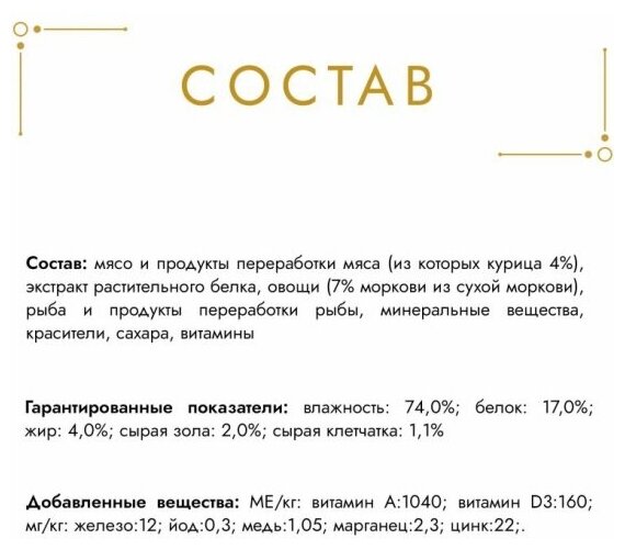 Курица и морковь: мясо и продукты переработки мяса (из которых курица 4%), экстракт растительного белка, овощи (7% моркови из сухой моркови), рыба и продукты переработки рыбы, минеральные вещества, красители, сахара, витамины.