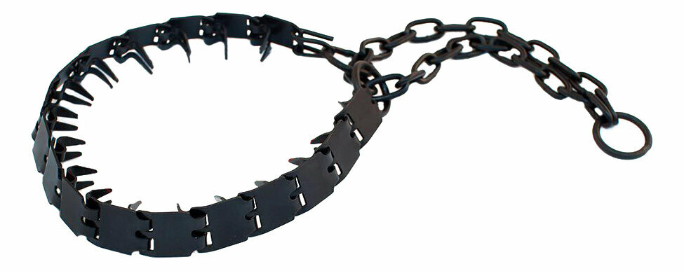 Ошейник из металлических пластин с загнутыми со стороны шеи собаки шипами высотой 1см. Детали ошейника обработаны воронением.