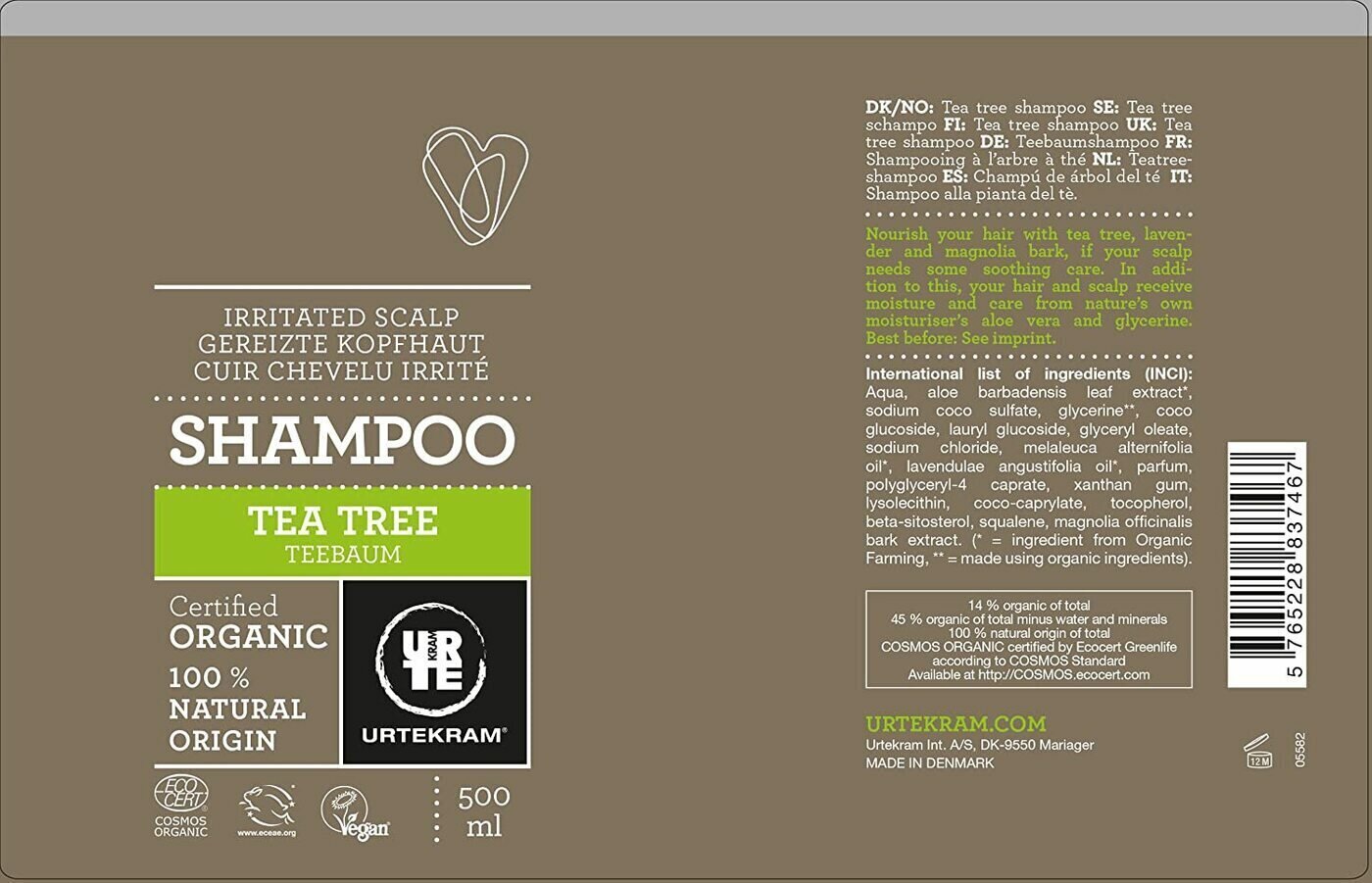 Органический шампунь для раздраженной кожи головы. Чайное дерево, лаванда и кора магнолии обеспечивают бережный, успокаивающий и гармонизирующий уход. В дополнение к этому алоэ вера и растительный глицерин поддерживают идеальное увлажнение. Вся продукция Urtekram имеет сертификат самого требовательного стандарта для био/органической косметики COSMOS ORGANIC (certified by Ecocert Greenlife ) А по ряду критериев продукция Urtekram превосходит и этот высокий стандарт. Несмотря на допустимые этим стандартом 2% синтетических ингредиентов, все составляющие Urtekram на 100% - натурального природного происхождения. Также отличительной особенностью Urtekram является то, что компания не использует спирт в качестве консерванта. Способ применения: Нанесите небольшое количество шампуня на влажные волосы, помассируйте, промойте водой.