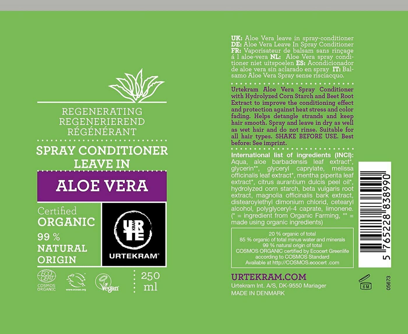 Органический восстанавливающий несмываемый спрей-кондиционер с гидролизованным кукурузным крахмалом и экстрактом сахарной свеклы, защищает волосы от теплового воздействия, стресса и препятствует потере цвета. Помогает распутать и разгладить волосы, облегчает укладку. Вся продукция Urtekram имеет сертификат самого требовательного стандарта для био/органической косметики COSMOS ORGANIC (certified by Ecocert Greenlife ) А по ряду критериев продукция Urtekram превосходит и этот высокий стандарт. Несмотря на допустимые этим стандартом 2% синтетических ингредиентов, все составляющие Urtekram на 100% - натурального природного происхождения. Также отличительной особенностью Urtekram является то, что компания не использует спирт в качестве консерванта.