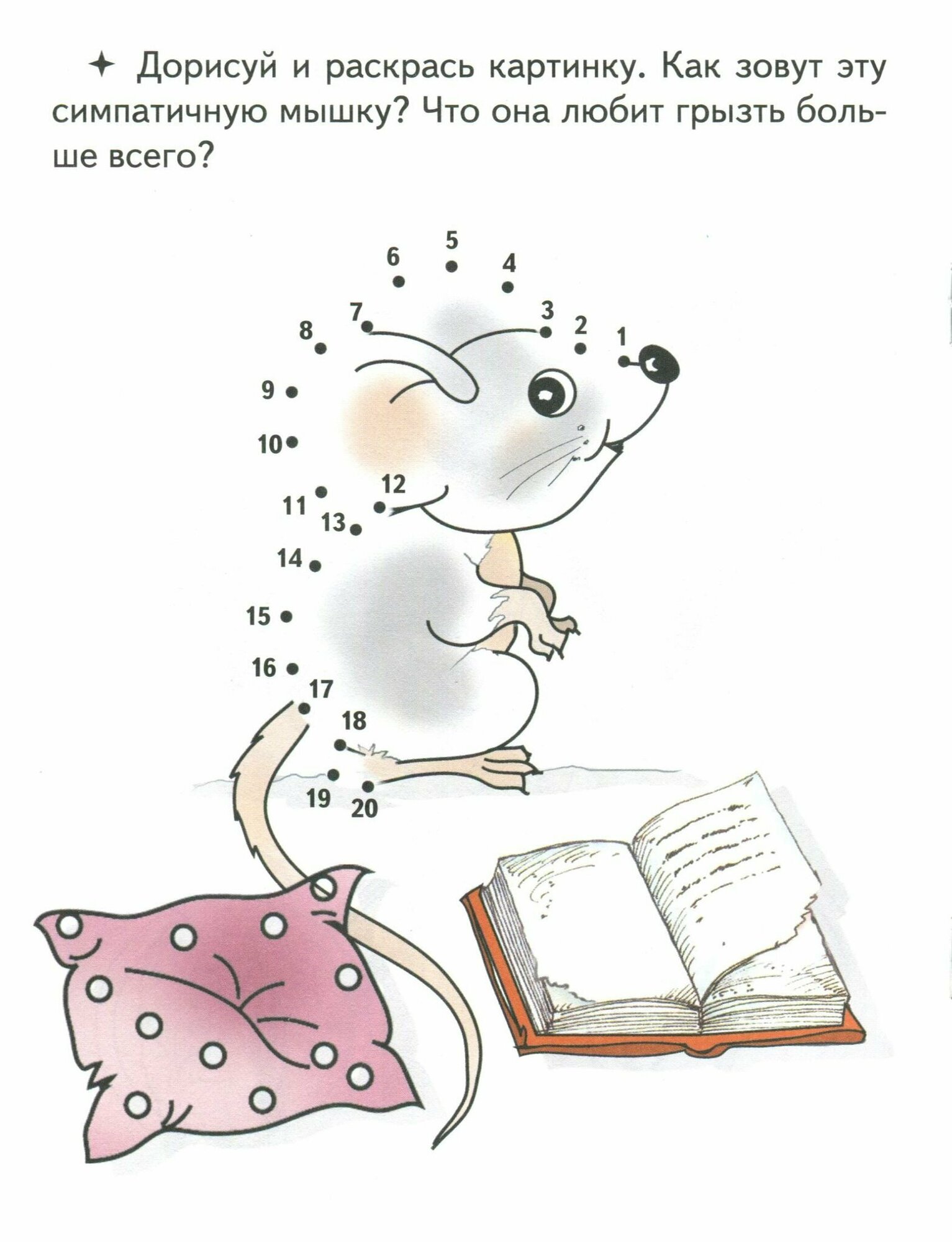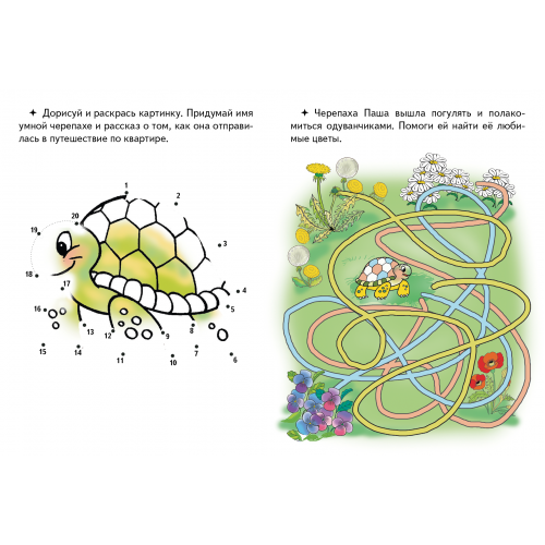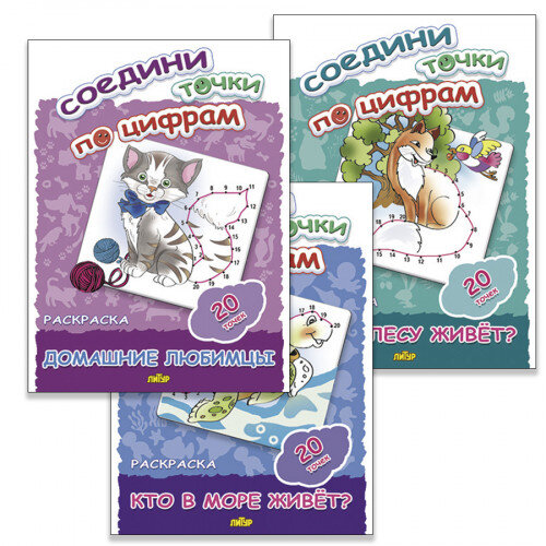 В этой книжке есть несколько уже частью раскрашенных картинок, недостающую часть которых можно восстановить, соединив 20 точек. Сами картинки по своему качеству замечательные. Детализированные, выполнены на плотной бумаге. Можно стирать и соединять все вновь. Отличный тренажер для того, чтобы повторять счет. Обложка из плотной бумаги, если не сыро, то прекрасно защищает от неприятностей.