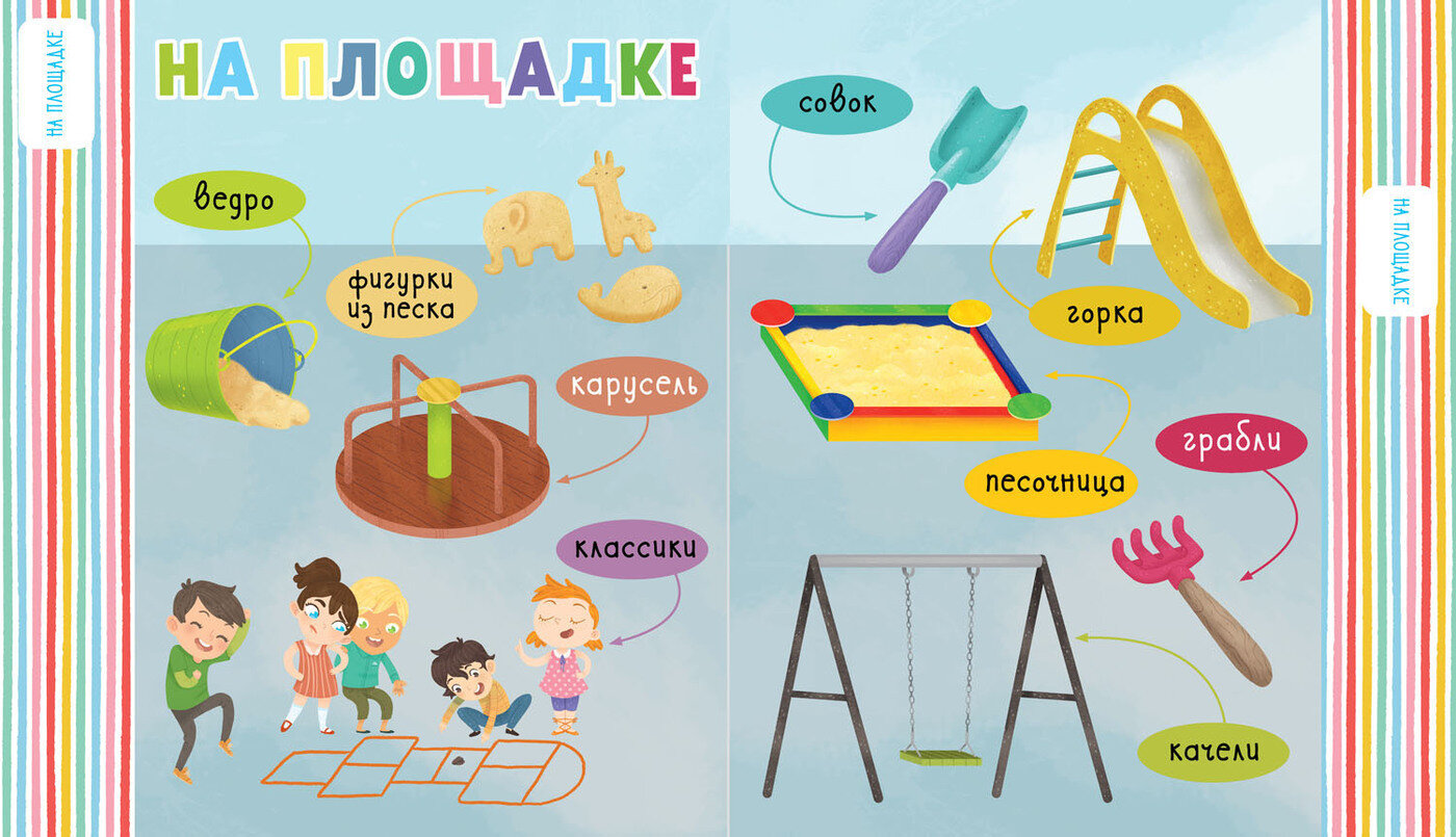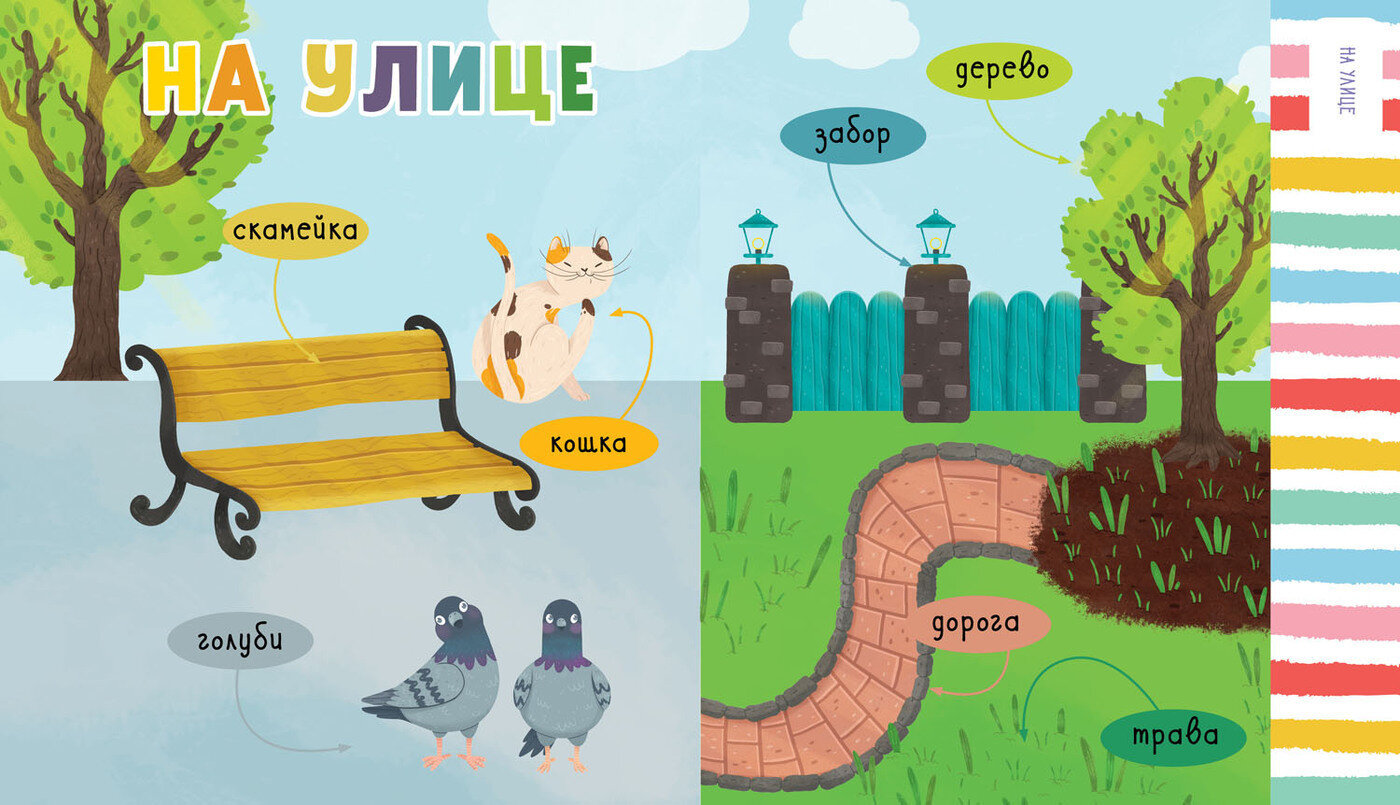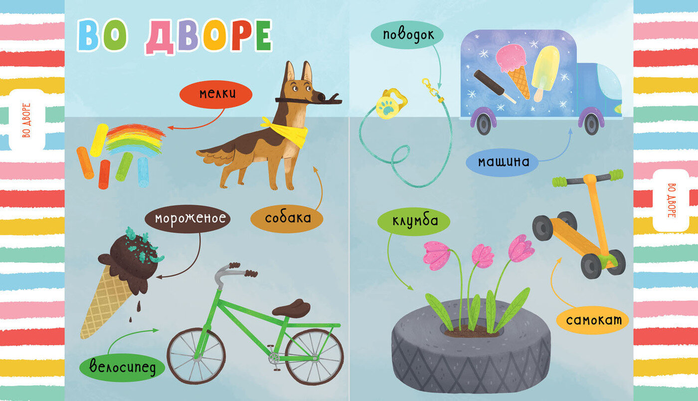 Книга «Гуляем во дворе. Визуальный словарь» подойдет даже годовалым малышам и может стать первым визуальным словарем вашего ребенка. Здесь собраны темы и предметы, которые малыш может встретить во дворе. На страничках книги вы увидите детскую площадку, улицу, двор, пруд и даже пикник. Что можно найти во дворе? Кто плавает в пруду? Где рисуют мелками? Рассматривайте картинки и знакомьтесь с окружающим миром! Яркие и узнаваемые иллюстрации помогут запомнить новые предметы и слова