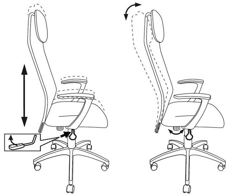 Спина - сетка , труба эргономичного гиба, Ширина сиденья 525 мм Высота эргономичной спинки 740 мм Подлокотники - независимые относительно крепления к спине. Механизмы: газлифт, механизм качания спинки.