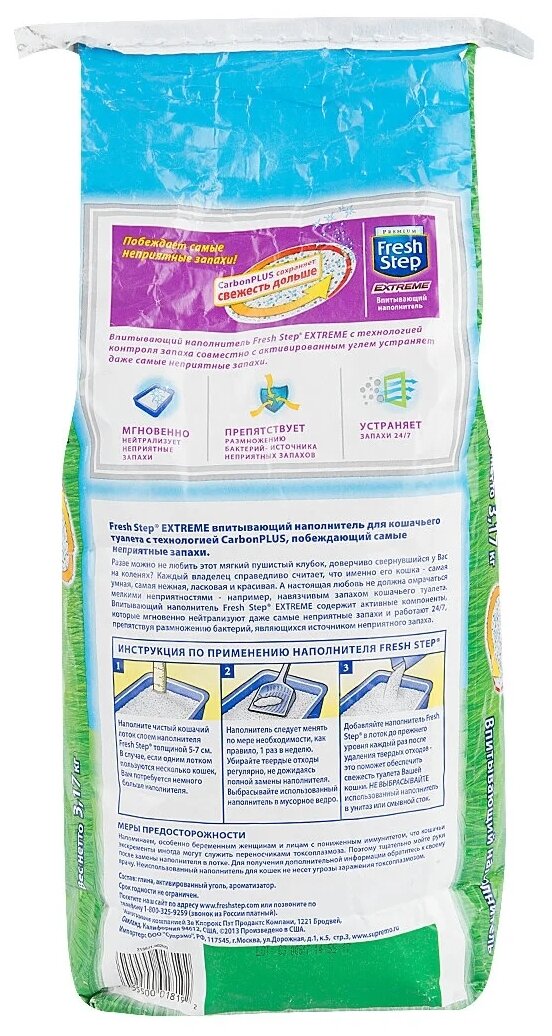 Впитывающий наполнитель Fresh Step в упаковках по 9,52 кг обеспечивает тройной контроль над появлением неприятных запахов. Синие, зеленые и голубые глиняные гранулы эффективно поглощают влагу, нейтрализуют запах и освежают воздух. Наполнитель способен вобрать в себя троекратный объем жидкости и требует редкой замены. В производстве не используются вредные компоненты, поэтому продукт абсолютно безвреден для людей и животных. Особенности Каждый тип гранул отвечает за свою сферу (впитывать, удалять, освежать), дополняя и усиливая действие друг друга. Средние по размеру фракции очень удобны для перемещений кошки, поскольку лапы не проваливаются в толщу наполнителя. Ненавязчивый аромат исходит от лотка только в момент его использования, поэтому не является раздражающим фактором. В состав наполнителя входят бактерицидные компоненты, которые поддерживают гигиеничность туалета на высоком уровне.