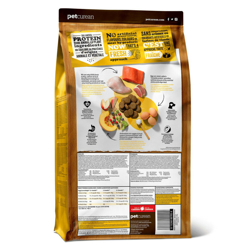 Полноценный беззерновой холистик корм для щенков всех пород в возрасте от 2 до 12 месяцев из филе индейки, утки и овощей, выращенных на канадских фермах, и филе лосося, выловленного в озерах Британской Колумбии.