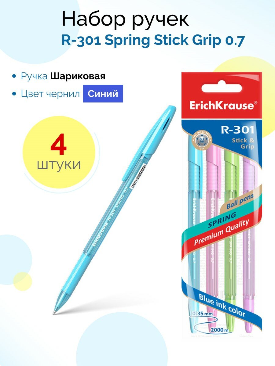 Ручка шариковая Erich Krause R-301 Spring 0.7 Stick&Grip 4 шт. (42750)