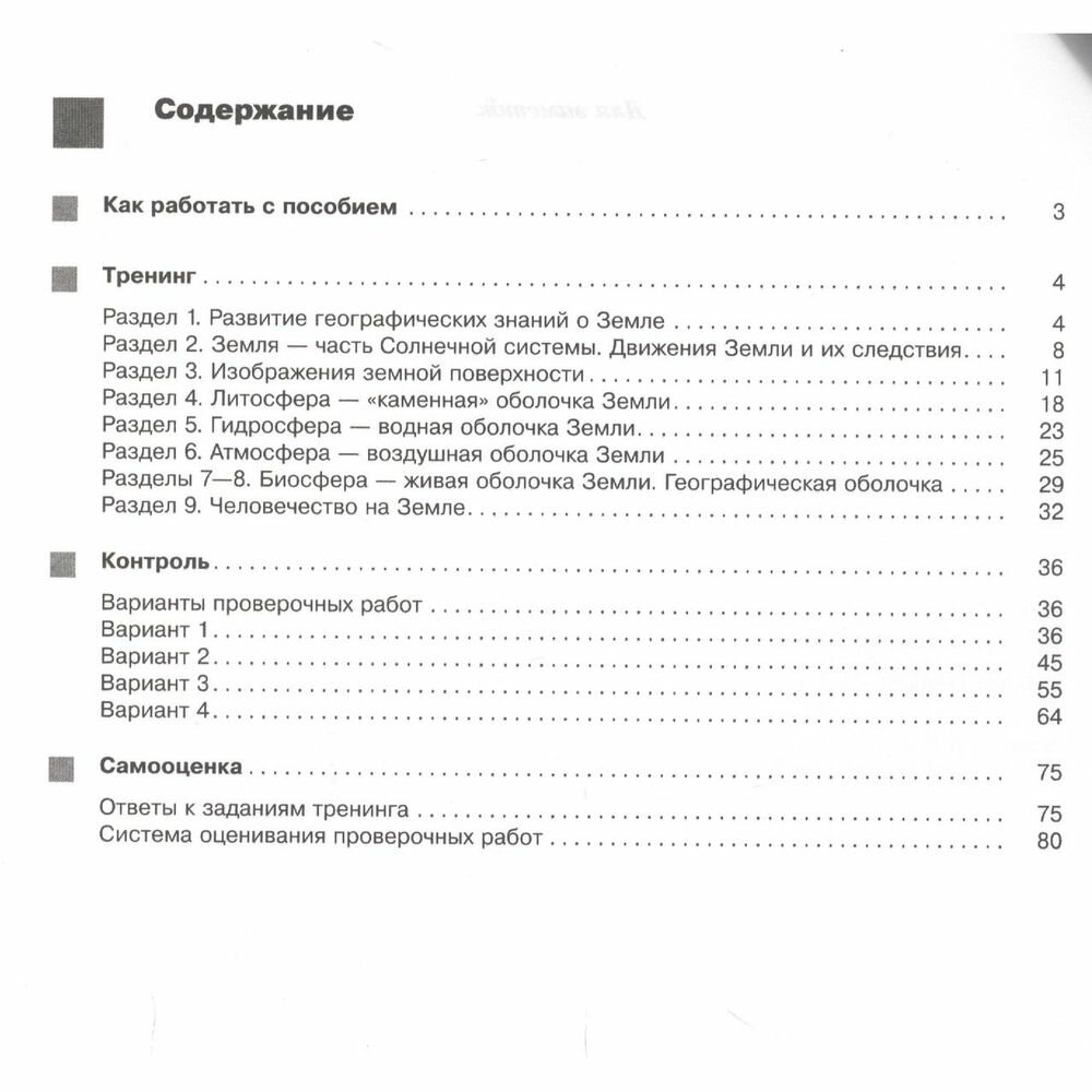 В пособии представлены тренировочные задания и четыре варианта проверочных работ по географии, содержание и структура которых соответствуют официальному образцу Всероссийской проверочной работы по географии. Пособие позволит осуществить текущий контроль знаний, а также отработать умения и навыки, необходимые для успешного выполнения проверочной работы. Оценить уровень своей подготовки учащиеся смогут с помощью раздела "Самооценка".