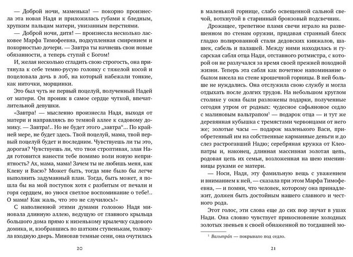 Очень хорошая, интересная и красивая книга! Возможно, потому что произведение основано на реальных событиях, главная героиня получилась настоящей и живой (не надуманной, как это иногда бывало в книгах Чарской). В Надю по-настоящему веришь от начала и до конца. Прекрасная, захватывающая книга, рекомендую к прочтению!