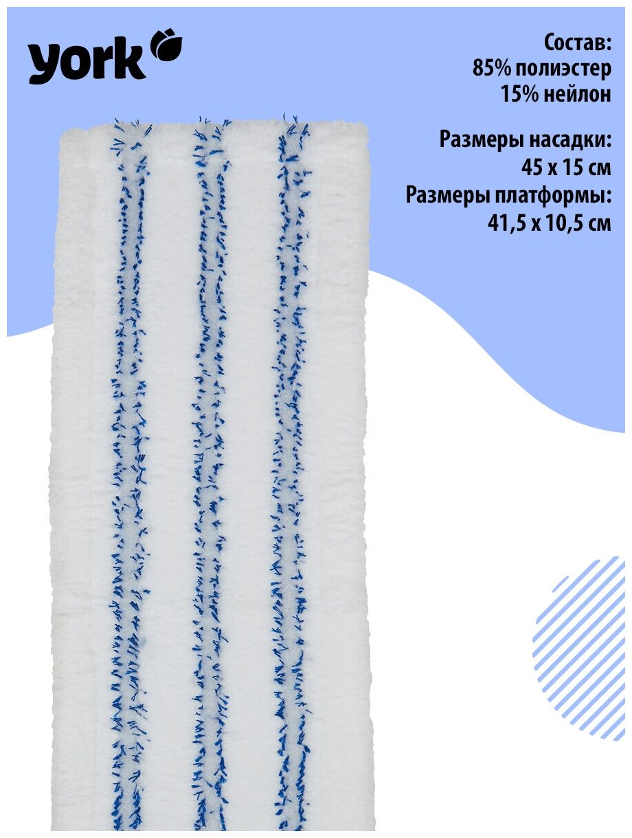 Насадка из микрофибры для швабры Смарт йорк Преимущества: - Удаляет самые стойкие загрязнения без использования моющих средств за счет вставок из абразивного материала. Вставки имеют более жесткие и длинные волокна - Идеально соответствует для покрытий из дерева - Подходит для мытья всех видов полов Применяется для плоской швабры. Предназначена для мытья полов, для сухой и влажной уборки. Материал: 85% полиэстер, 15% нейлон Размеры насадки: 45х15 см Размеры платформы: 41,5х10,5 см Вес: 70 г