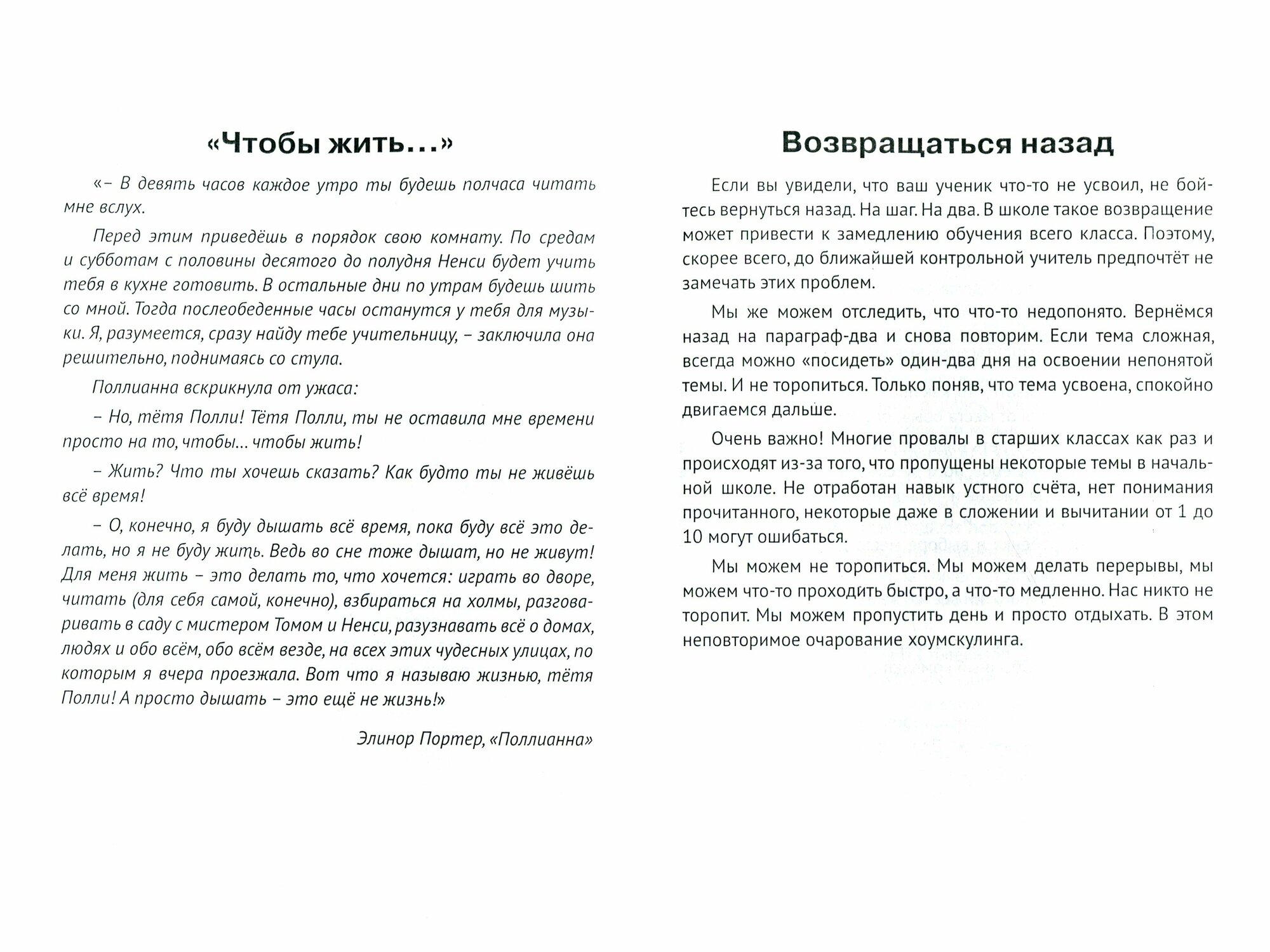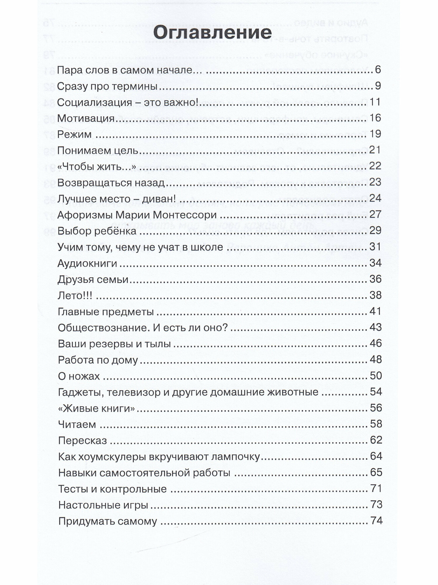 Книга на 100 страниц с короткими, но емкими статьями-главами. В принципе,освещены все основные моменты и тонкости семейного образования. Подойдёт для тех, кто делает свои первые шаги в этом направлении. Бывалые вряд ли найдут для себя новую информацию в этой книге. Книга читается легко. Есть интересные советы.