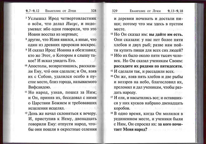 Святое Евангелие крупным шрифтом, с выделенными словами Спасителя