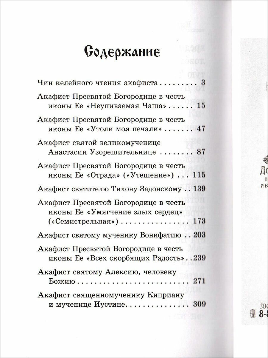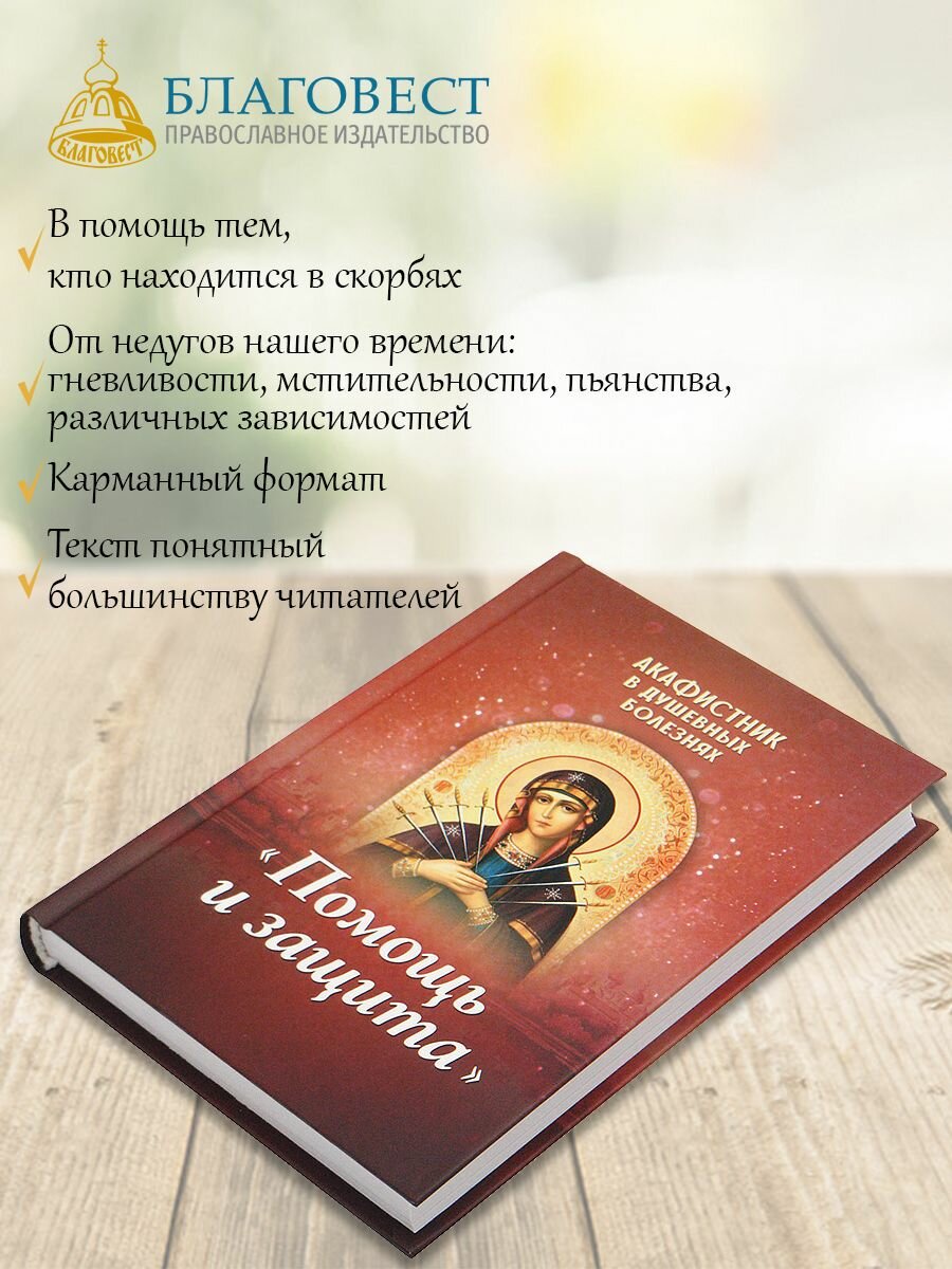 Акафистник в душевных болезнях "Помощь и защита" содержит акафисты Пресвятой Богородице в честь Ее икон "Неупиваемая Чаша", "Утоли моя печали", "Отрада" ("Утешение"), "Умягчение злых сердец", "Всех скорбящих Радость" и святым - великомученице Анастасии Узорешительнице, святителю Тихону Задонскому, мученику Вонифатию, Алексию человеку Божию, священномученику Киприану и мученице Иустине. В гражданской (русской) орфографии, с ударениями.