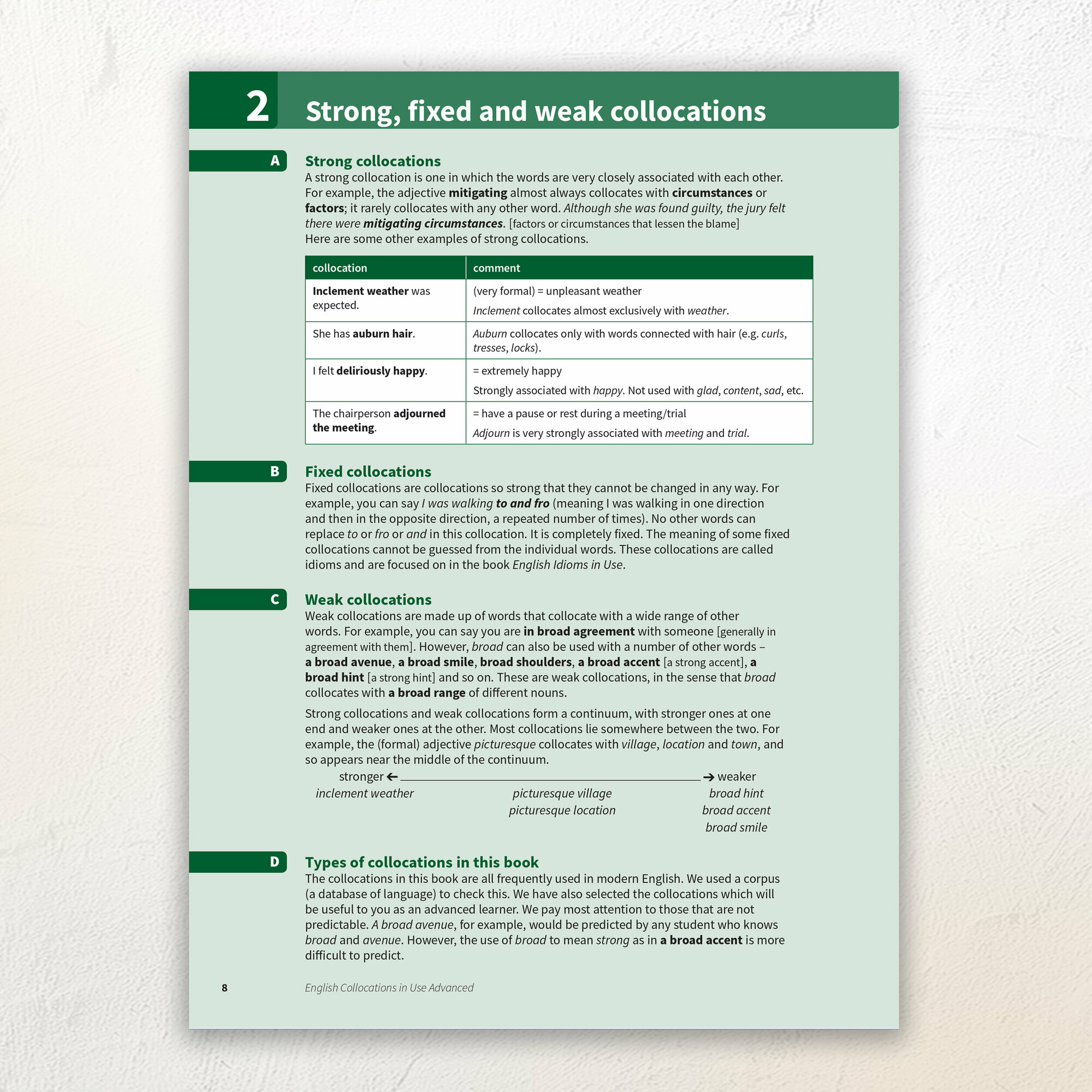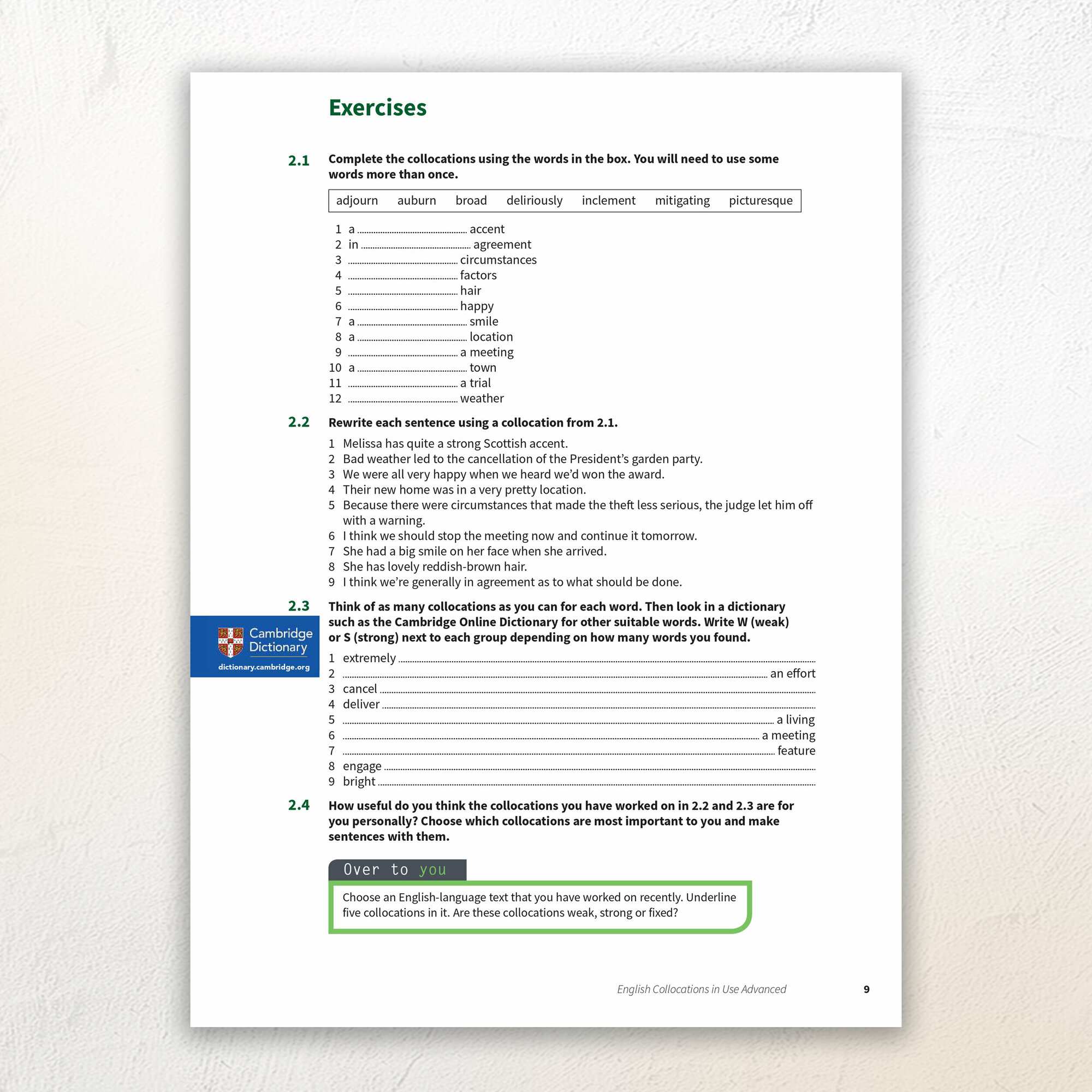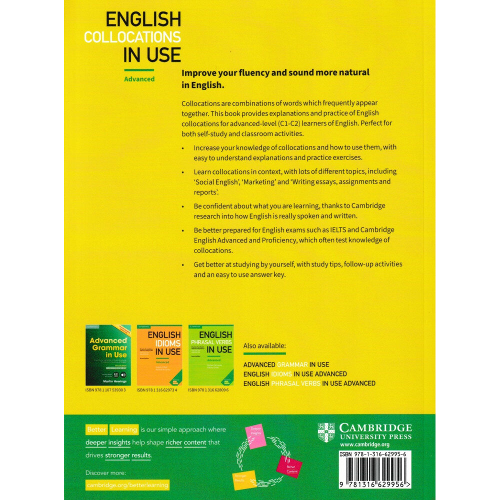 Improve your fluency and sound more natural in English. Collocations are combinations of words which frequently appear together. This book contains explanations and practice of English collocations for advanced-level (C1 to C2) learners of English. Perfect for both self-study and classroom activities. Learn collocations in context, with lots of different topics, including 'Writing essays, assignments and reports'. Be confident about what you are learning, thanks to Cambridge research into how English is really spoken and written, and get better at studying by yourself, with study tips and follow-up activities. This book is also perfect for preparing for Cambridge exams and IELTS, which often test knowledge of collocations.