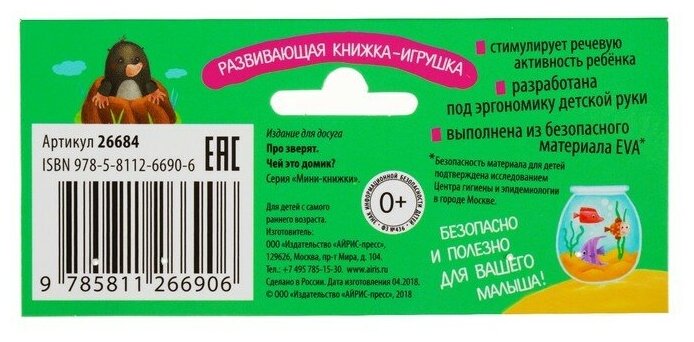 Книжка-игрушка компактного формата для развивающих занятий с детьми. Малыш с удовольствием будет рассматривать забавные картинки и узнает, где живут рыбки, пчёлы, собаки и медведи. Занятия помогут развить активную речь и мелкую моторику.
