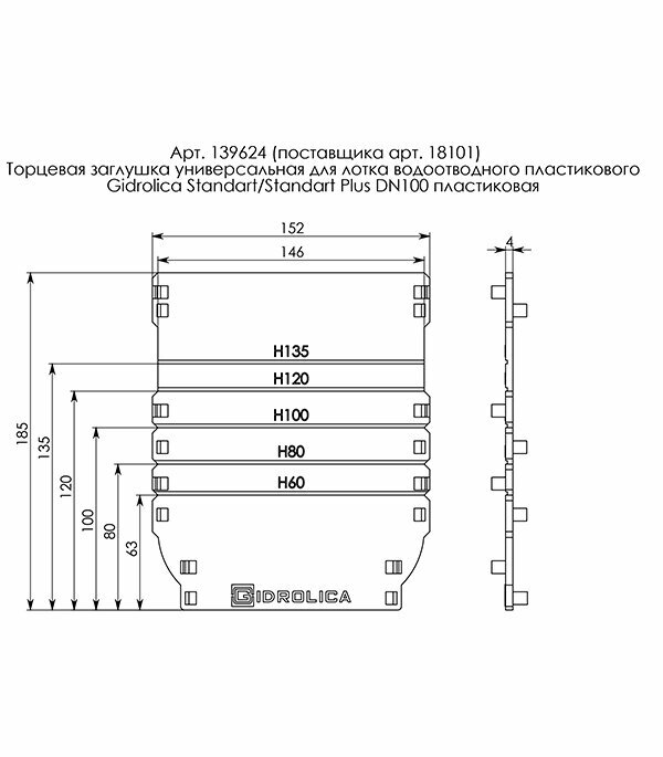 Заглушка торцевая Gidrolica 152x185x4 мм предназначена для пластикового водоотводного лотка Standart и Standart Plus с шириной гидравлического сечения DN100. Элемент выполняет уплотнительную функцию, закрывает нижний зазор между лотками различного объема.