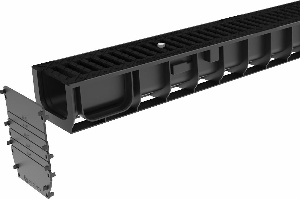 Универсальная заглушка устанавливается на торец пластикового водоотводного лотка в начале или в конце линии ливневой канализации.