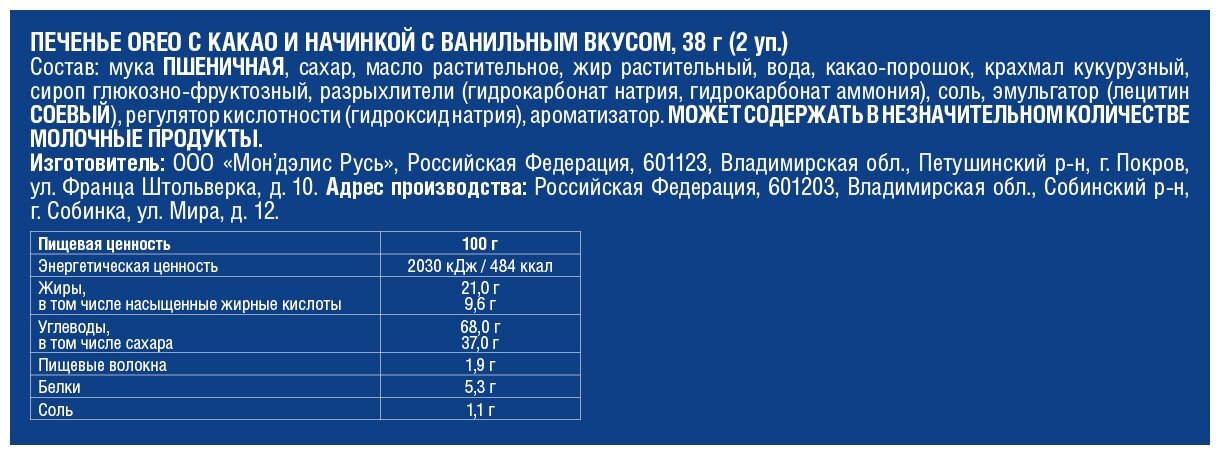 | Состав | мука пшеничная, сахар, жир растительный, масло растительное, вода, какао-порошок, крахмал кукурузный, сироп глюкозно-фруктозный, соль, разрыхлитель (гидрокарбонат натрия), эмульгаторы (лецитин соевый, лецитин подсолнечный), ароматизатор ванилин. содержит пшеницу, глютен, лецитин соевый. может содержать следы яиц, молочных продуктов. |