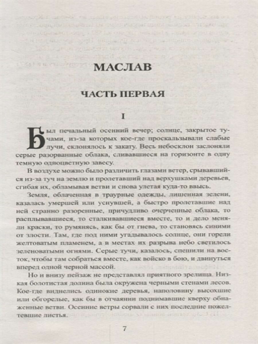 Роман "Маслав" рассказывает о событиях 1030-х годов, когда после смерти короля Мешко II в Древнепольском государстве началась смута. Сын покойного короля, Казимир, позднее прозванный Восстановителем, возвращается в разоренную страну, чтобы навести в ней порядок, но не Казимир является главным героем повествования. На первое место выходит противостояние между верными воинами покойного Мешко и бывшим королевским виночерпием Маславом, который, желая стать новым королем, захватывает поместья и крепости, но лишь одна не хочет ему покориться - Ольшовский замок.