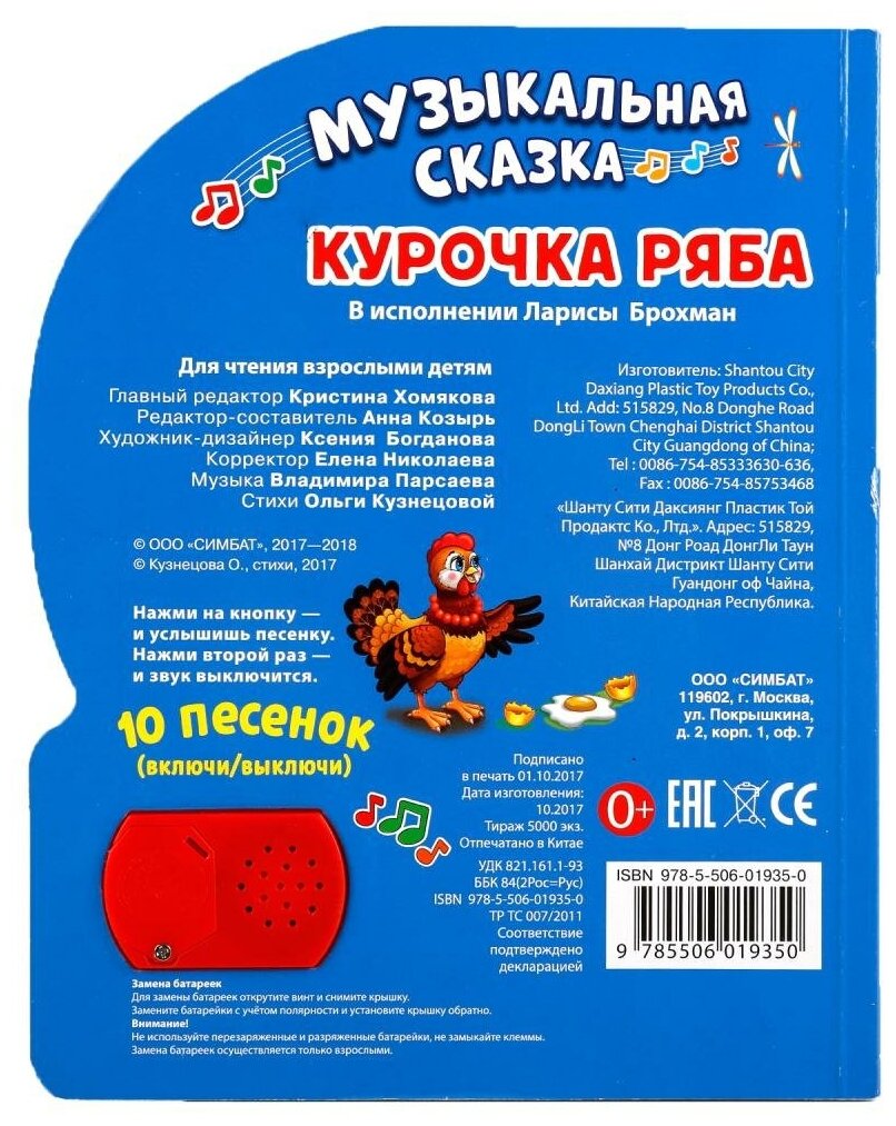 Ребенок с удовольствием будет листать плотные страницы с яркими картинками, нажимать на кнопку с рисунком и слушать песенки по мотивам сказки. Одно нажатие на кнопку – песенка включится, второе нажатие – выключится. Книжка сделана из плотного картона, поэтому родители могут не опасаться за её сохранность. Благодаря компактному формату книгу удобно взять с собой в дорогу.