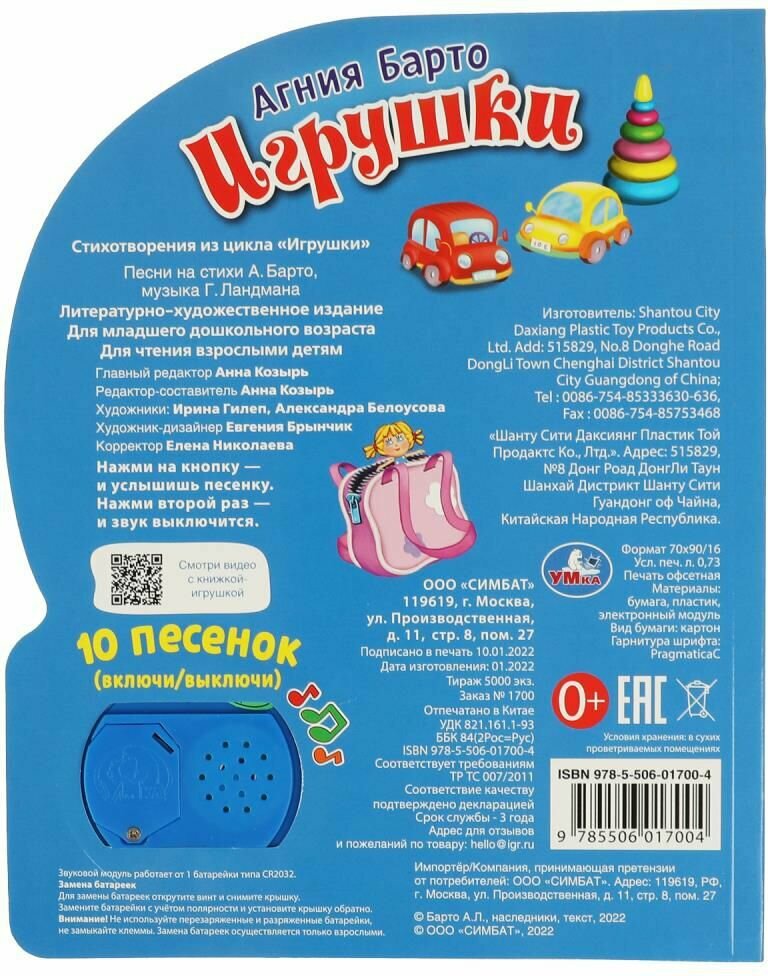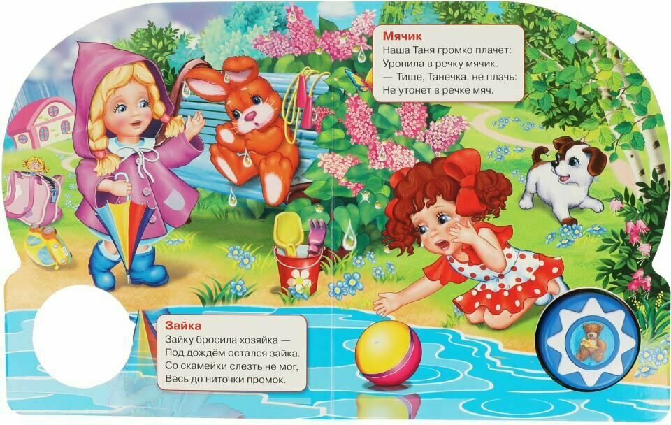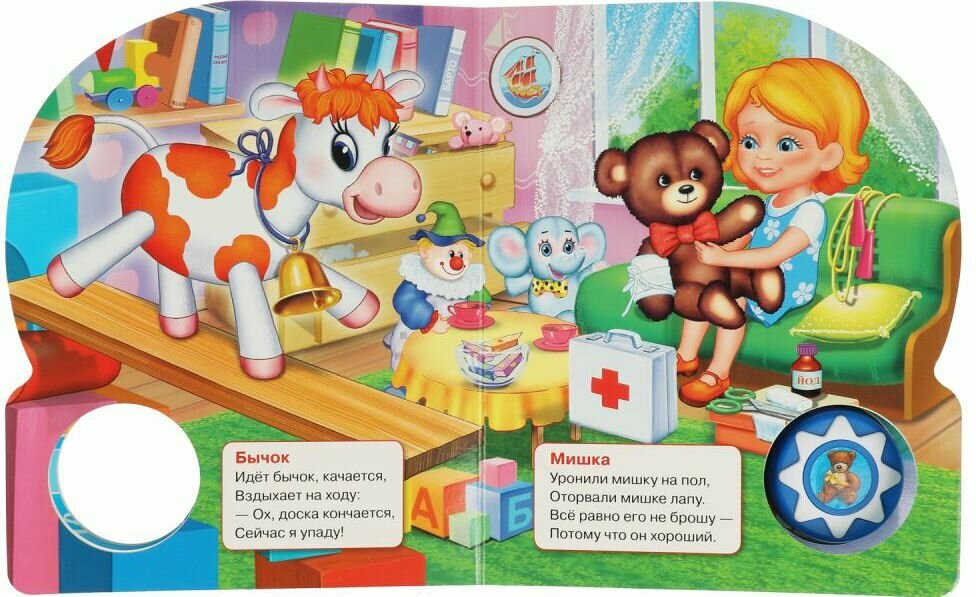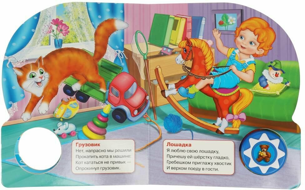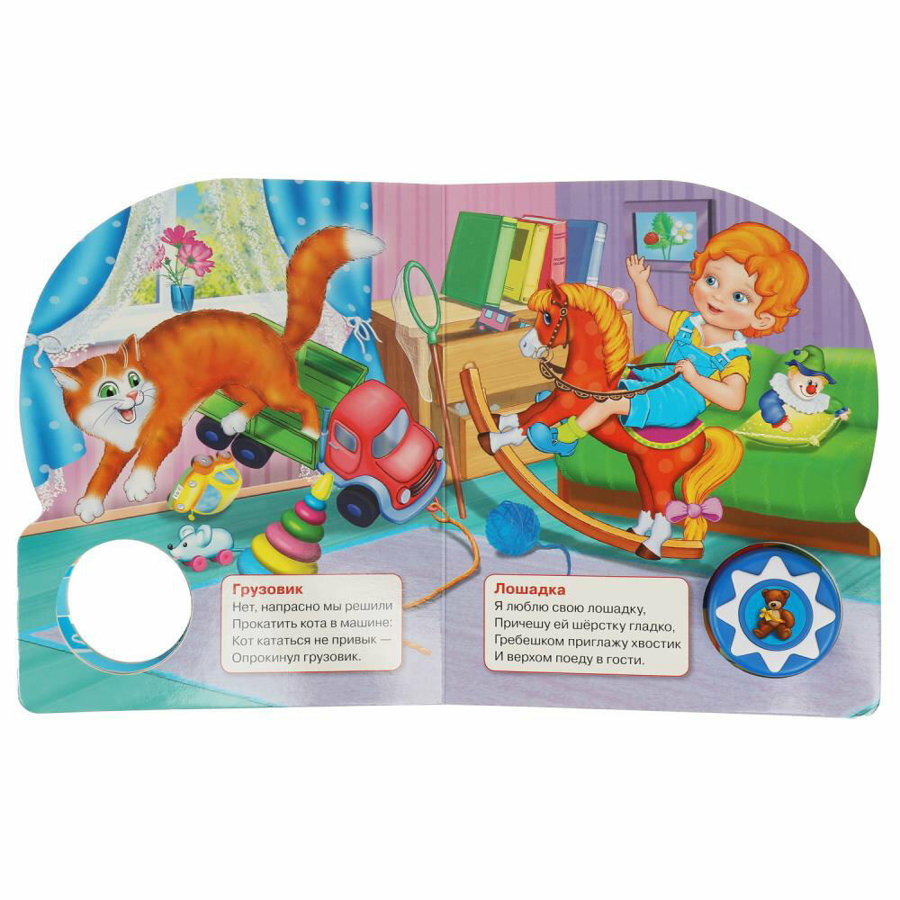 Ребенок с удовольствием будет листать плотные страницы с яркими картинками, нажимать на кнопку с рисунком и слушать добрые песенки на стихи Агнии Барто. Благодаря компактному формату книгу удобно взять с собой в дорогу.