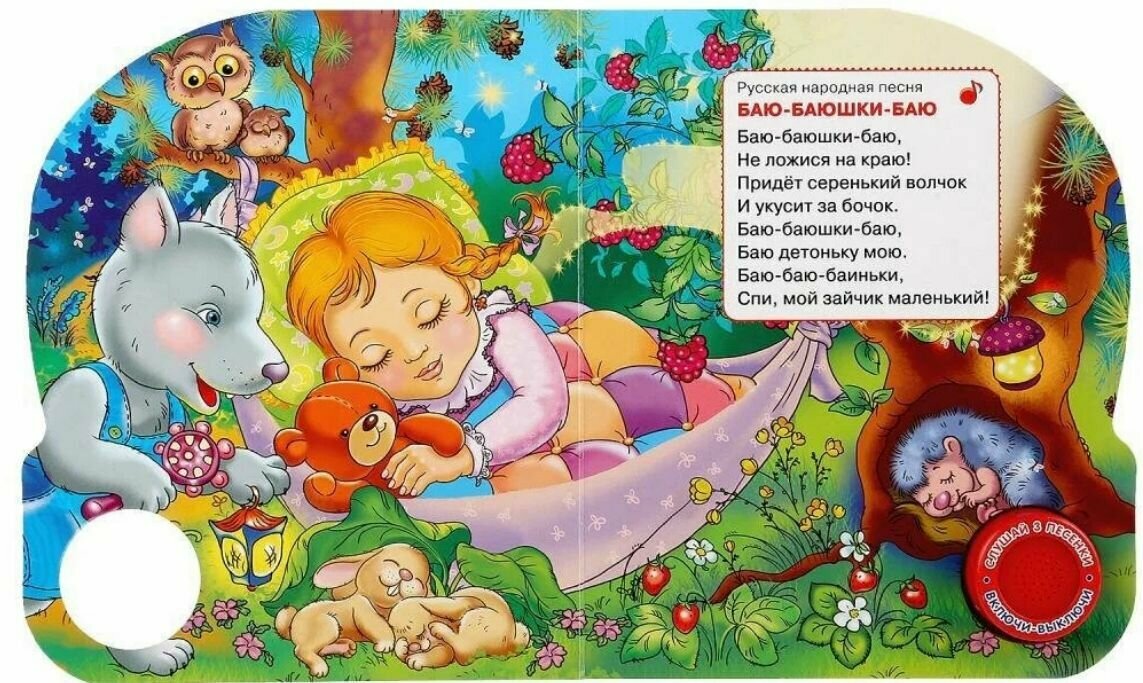 Предлагаем вам яркую развивающую книжку со звуковым модулем Колыбельные, которая поспособствует развитию памяти, моторики, внимания и мышления малыша. В книжке 3 песенки. Книжка с вырубкой.