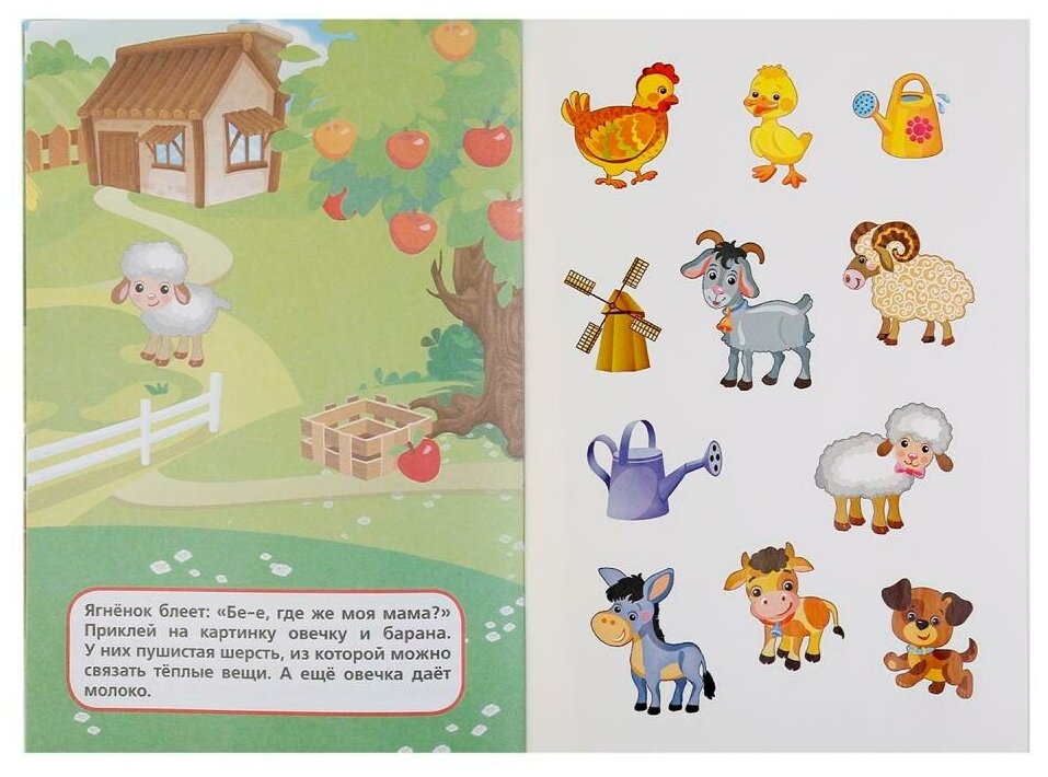 Данная книга помогает в первую очередь маме для организации домашних занятий. Красочные картинки с сюжетом по которым вместе с ребенком сочинять истории,сказки очень легко и приятно. Книга снабжена яркими наклейками с понятными картинками, в данном варианте домашними животными и инструментами. Вариантов для их расположения(наклеек) ни один,они имеют возможность и поменять их расположение при желании. Сочиняя, ребенок имеет возможность пофантазировать . Книга не исключает и возможность того,что ребенок и дорисует что то ,согласно своей фантазии и доклеет.