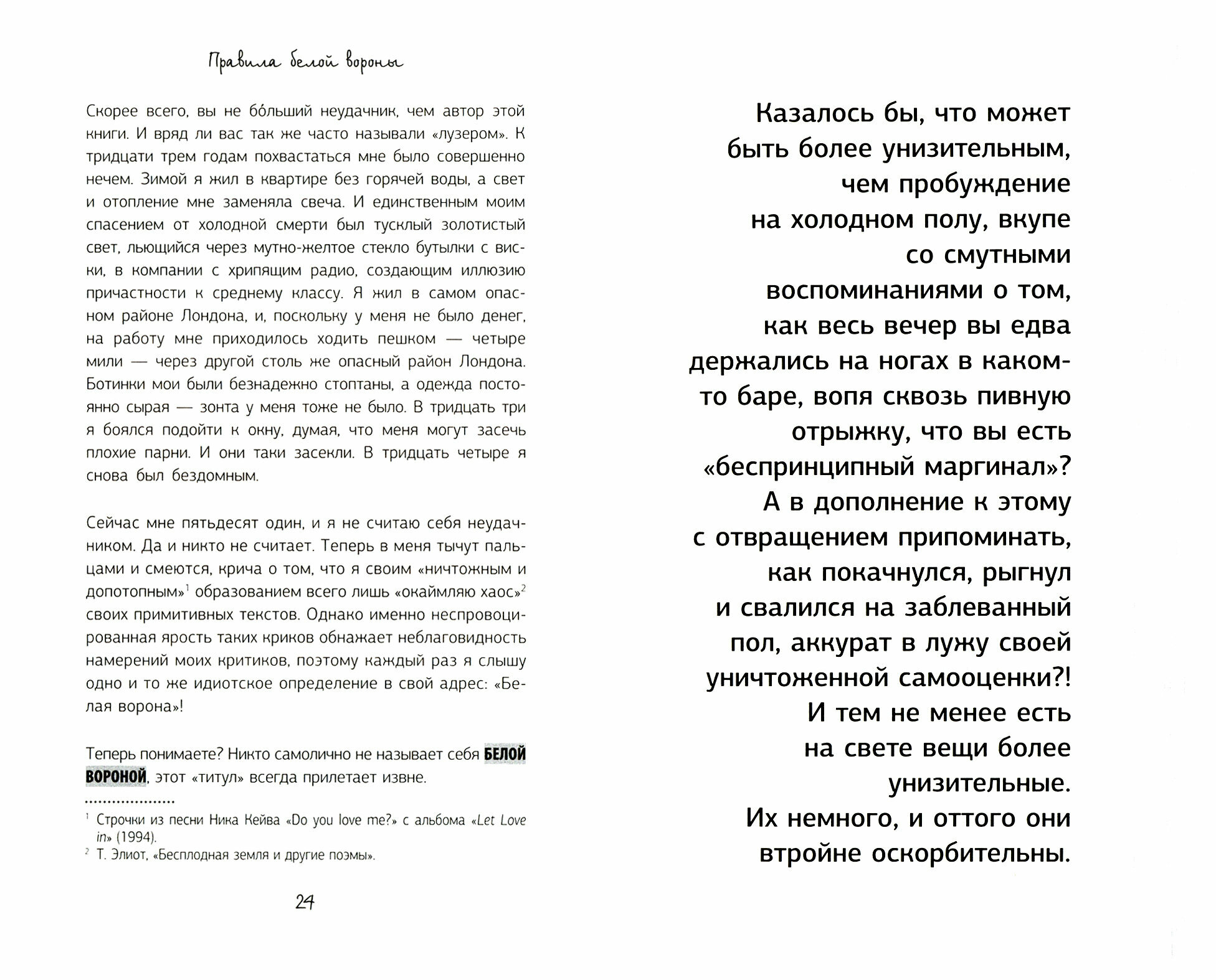 "Правила белой вороны" впрочем и имеют подзаголовок "манифест". По сути своей книга, это большая статья, растянутая оформлением и цитатами до размера полноценной книги. Оформление подкупает, иногда оно похоже на текст маньяка, набранный из газетных букв, иногда серо-графитное, иногда ступенчатое. От этого в восприятии случается некий хаос и текст сложно воспринять целостно.