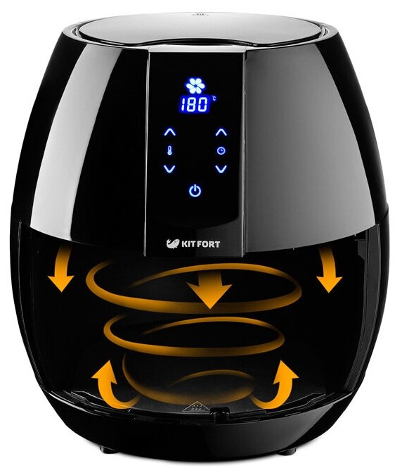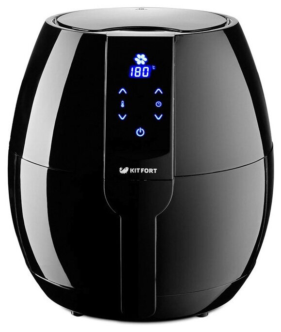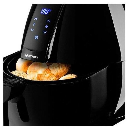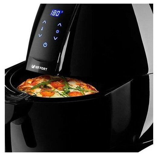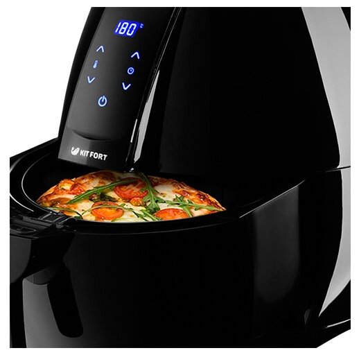 Современный аэрогриль Kitfort замечателен не только стильным дизайном. Он может использоваться как аэрогриль, а также как аэрофритюрница и духовка, и позволяет готовить большинство продуктов без добавления масла. При помощи системы циркуляции горячего воздуха продукты равномерно обжариваются со всех сторон и получаются нежными внутри и с хрустящей корочкой снаружи. Аэрогриль оснащен электронным управлением и дисплеем.