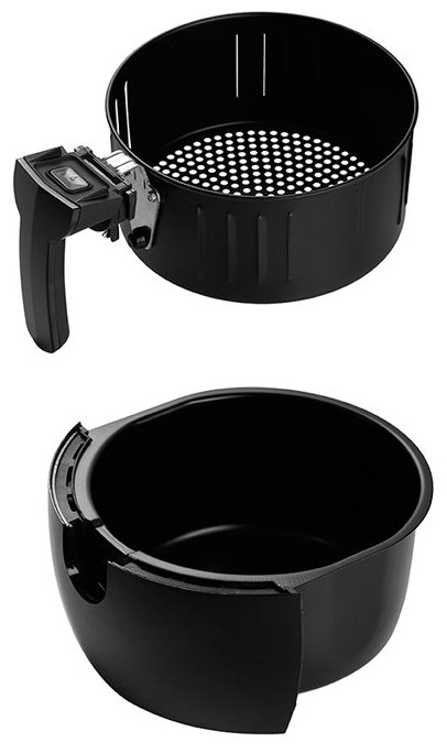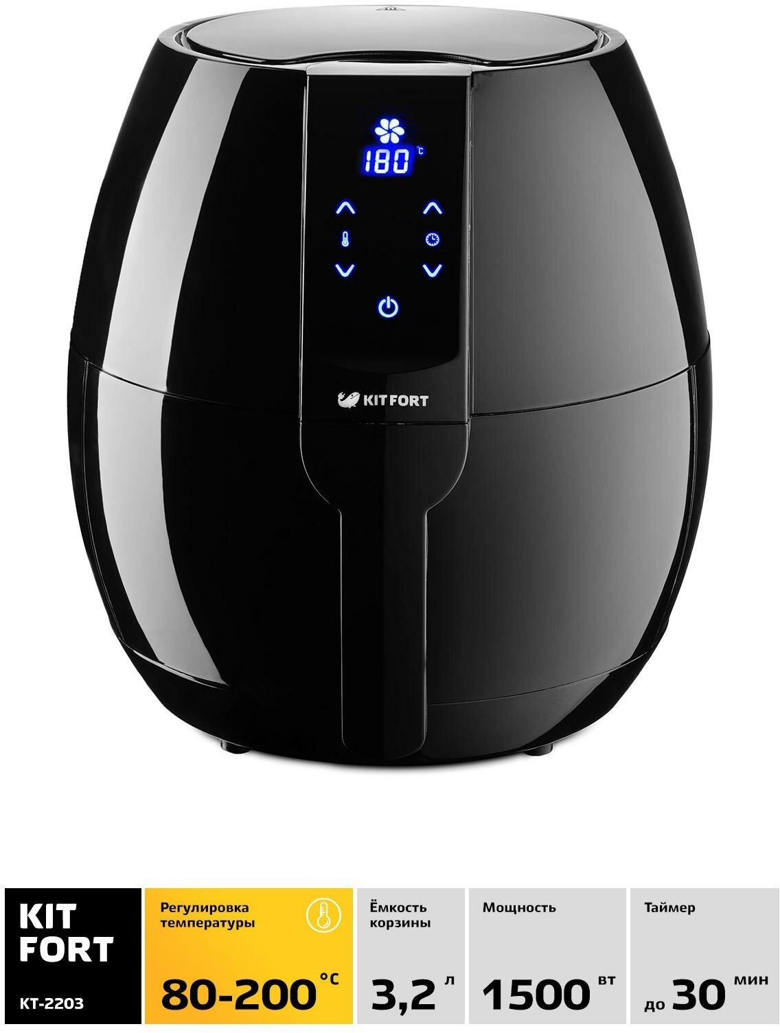 | Прочие особенности и свойства | Современный аэрогриль Kitfort KT-2203 замечателен не только стильным дизайном. Он может использоваться как аэрогриль, а также как аэрофритюрница и духовка, и позволяет готовить большинство продуктов без добавления масла. При помощи системы циркуляции горячего воздуха продукты равномерно обжариваются со всех сторон и получаются нежными внутри и с хрустящей корочкой снаружи.,Аэрогриль оснащён электронным управлением и дисплеем. Продукты готовятся в специальной корзине, которая вставлена в поддон с антипригарным покрытием. По окончании приготовления аэрогриль автоматически отключается. Поддон с корзиной легко вынимаются и моются. |