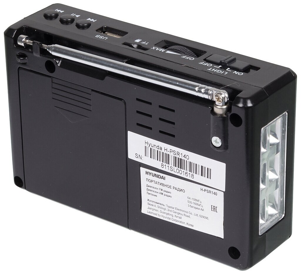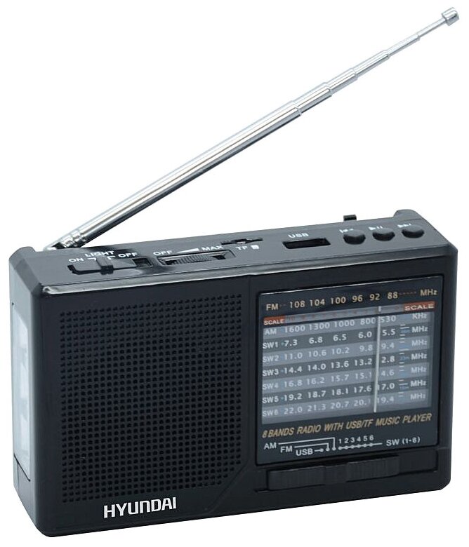 Hyundai - портативный радиоприемник с аналоговым тюнером. В этой модели объединены современное радио FM-диапазона и удобный цифровой MP3-плеер. Радиоприемник оснащен встроенной телескопической антенной,разъемом для подключения наушников, разъемом USB, а также слотом для карты памяти microSD. Мощность динамика обеспечивает качественное и громкое звучание популярных композиций. Три батарейки типа АА позволяют приемнику работать автономно.