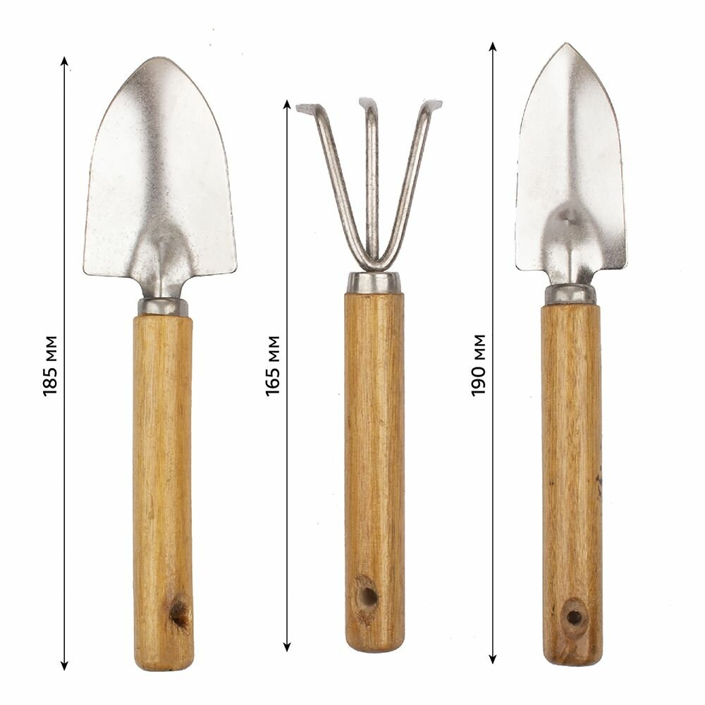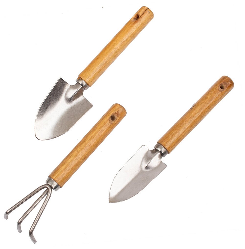 Набор для ухода за комнатными растениями, средний. Включает в себя три предмета: 2 совка для пересадки растений и рыхлитель грунта. Набор изготовлен из качественных материалов. Ручка выполнена из дерева, рабочие поверхности из металла, при необходимости их можно затачивать.