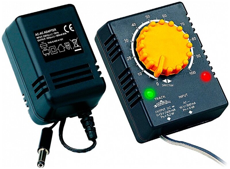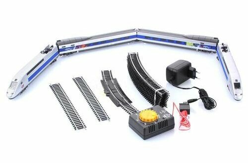 | Состав набора | 1 ведущий и 1 ведомый локомотив,2 вагона,11 радиальных рельс и 1 радиальный рельс/контактный,1 сетевой адаптер,1 пульт-контроллер,13 клипс/соединителей,инструкция |