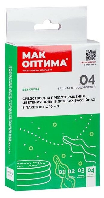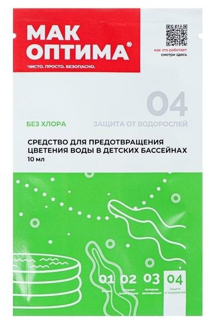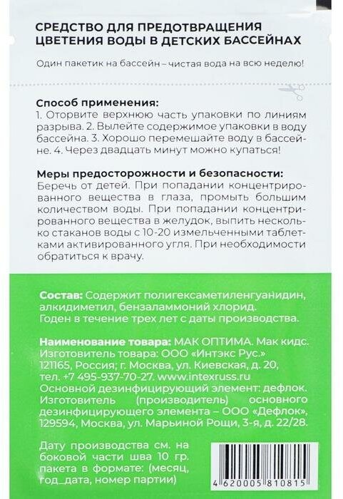 МАК KIDS эффективен против грибков и налета в воде и на стенках бассейна. Для его использования вам не потребуется специального обучения, достаточно всего прочитать инструкцию. Не требует установленного в бассейне фильтрационного оборудования. Комплект включает в себя 5 пакетов по 25 грамм. Один пакетик этого средства без хлора эффективен в течении одной недели.