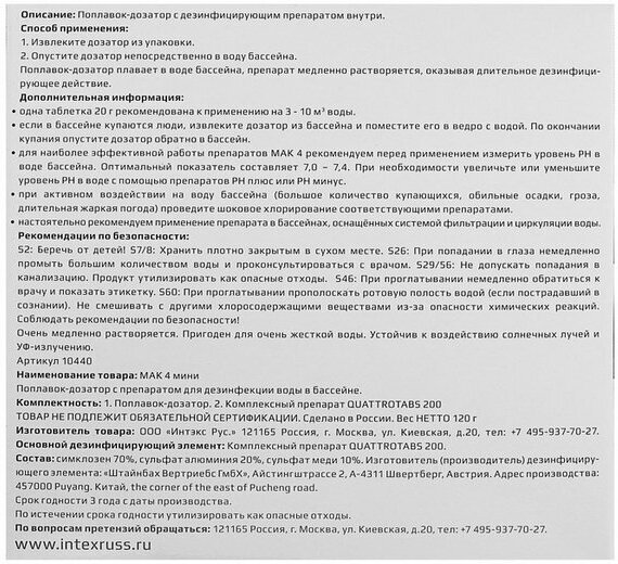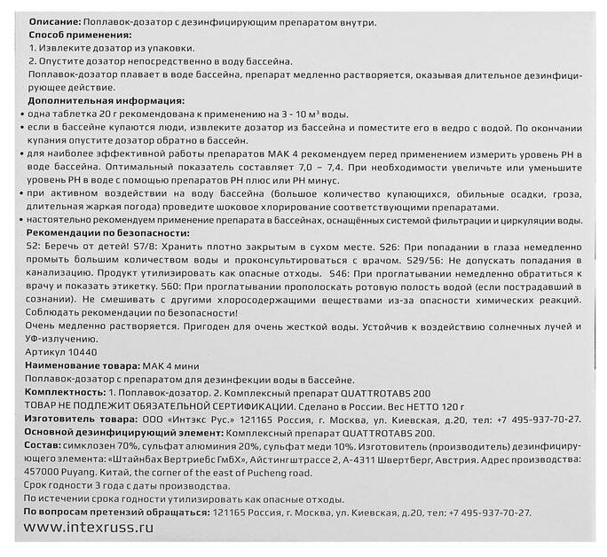 Модель: Комплексное средство для дезинфекции воды в бассейне Mak4mini в поплавке-дозатор